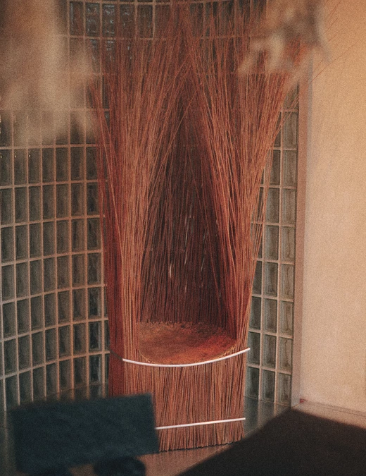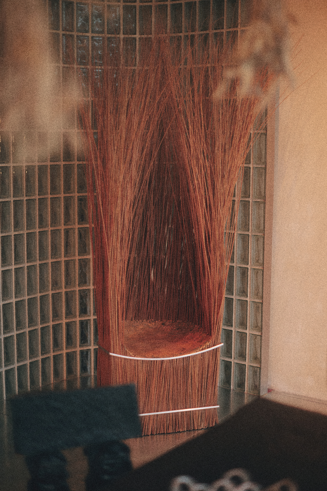 Sięgał po materiały naturalne – gałęzie, trawę, słomę, drewno, wiklinę – ale równie chętnie wykorzystywał metal, cegłę czy tkaninę.