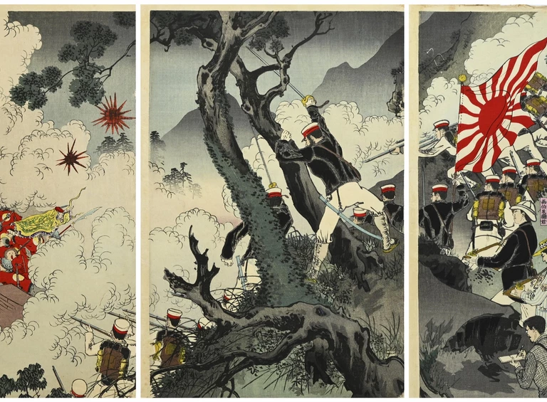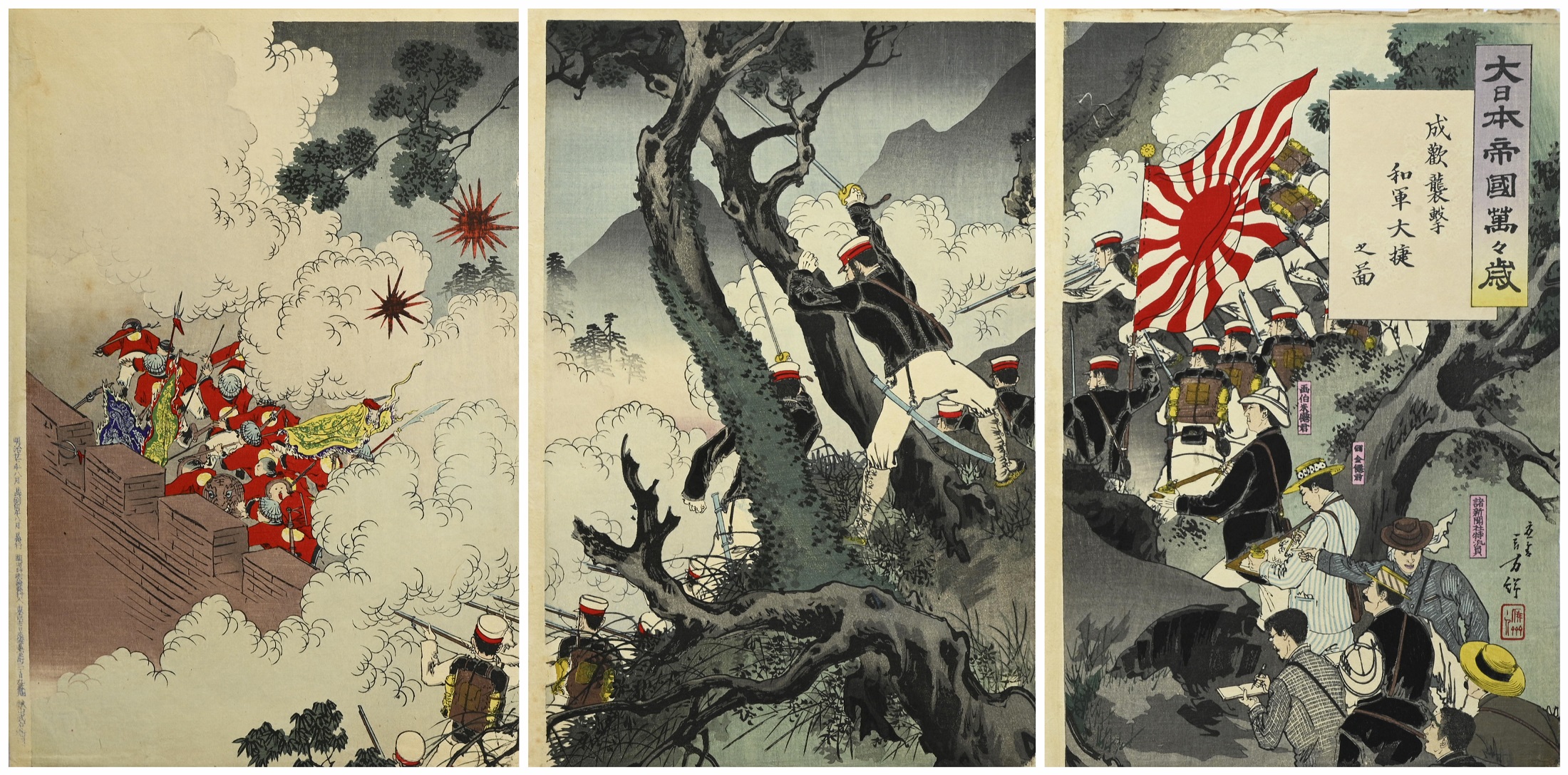 W czasie wojny chińsko-japońskiej artysta stworzył wiele kompozycji przedstawiających najważniejsze momenty konfliktu, pobudzające wyobraźnię publiczności rozentuzjazmowanej serią zwycięstw odniesionych przez mężne, nowoczesne wojsko japońskie w konfrontacji z Chinami.
