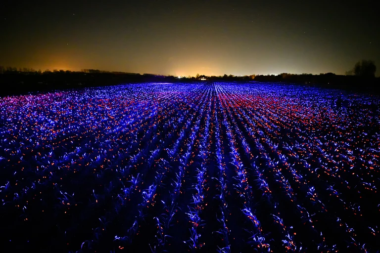 Te pięknie światła na 20000 metrach kwadratowych pola uprawnego zdają się mieć do czyniania więcej z poezją i magią niż nauką. Tymczasem według najnowszych badań wiązki światła niebieskiego, czerwonego i ultrafioletowego mogą zwiększyć wzrost roślin i zmniejszyć zużycie pestycydów nawet o 50%.