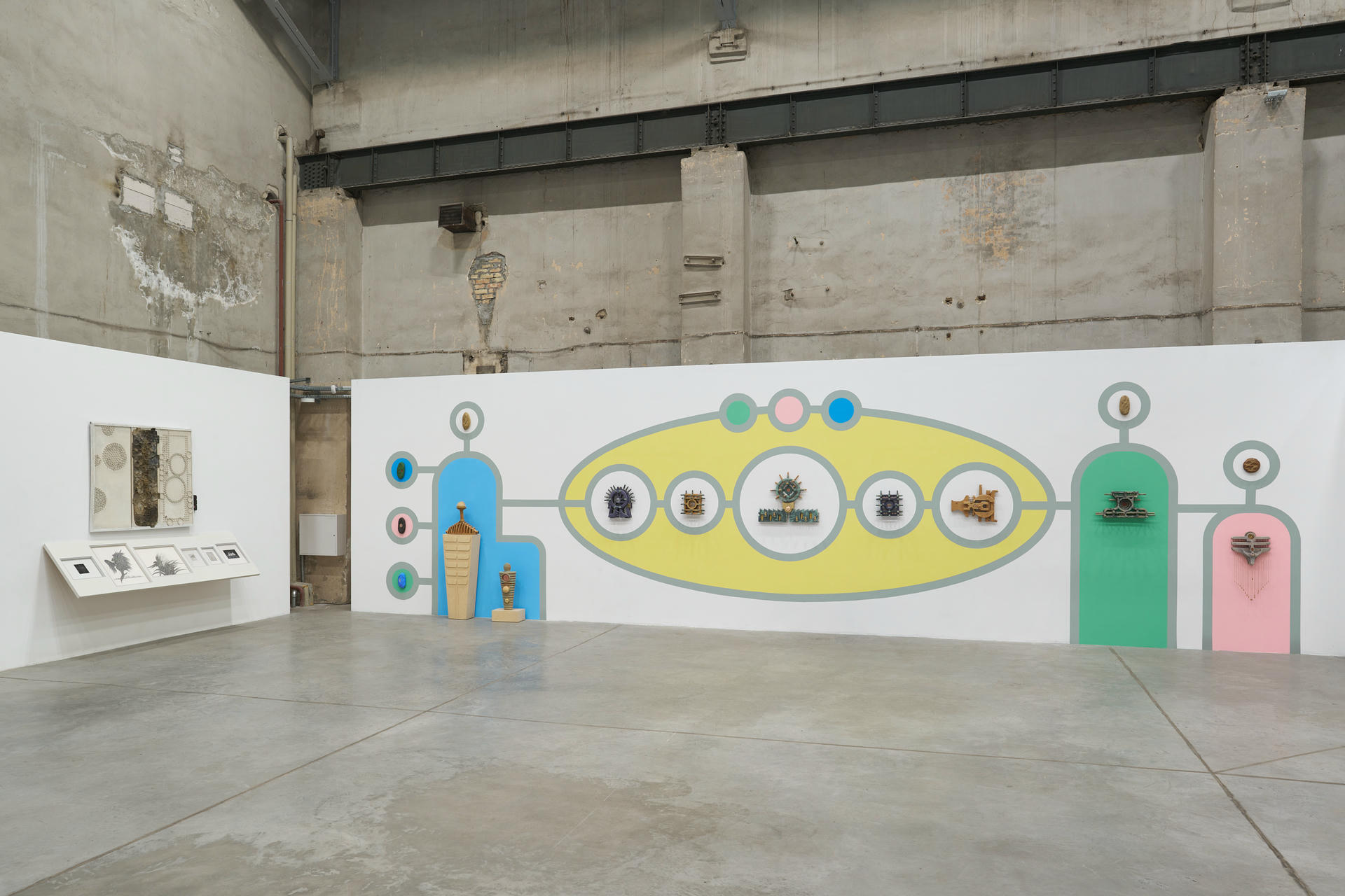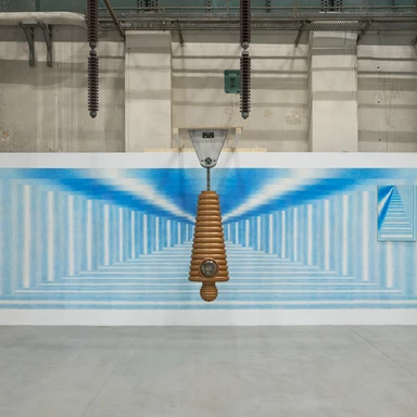Rafał Zajko, "Syzyf", 2023, włókno szklane, ceramika, aluminium, stal niskowęglowa, śruby, mechanizm wahadłowy; Zofia Artymowska, z cyklu "Poliformy XXXVIII: Drabina Jakubowa" (kompozycja różnostronna), 1973, akryl na płótnie, realizacja muralu: Ścianodruk. Fot. Tomasz Koszewnik