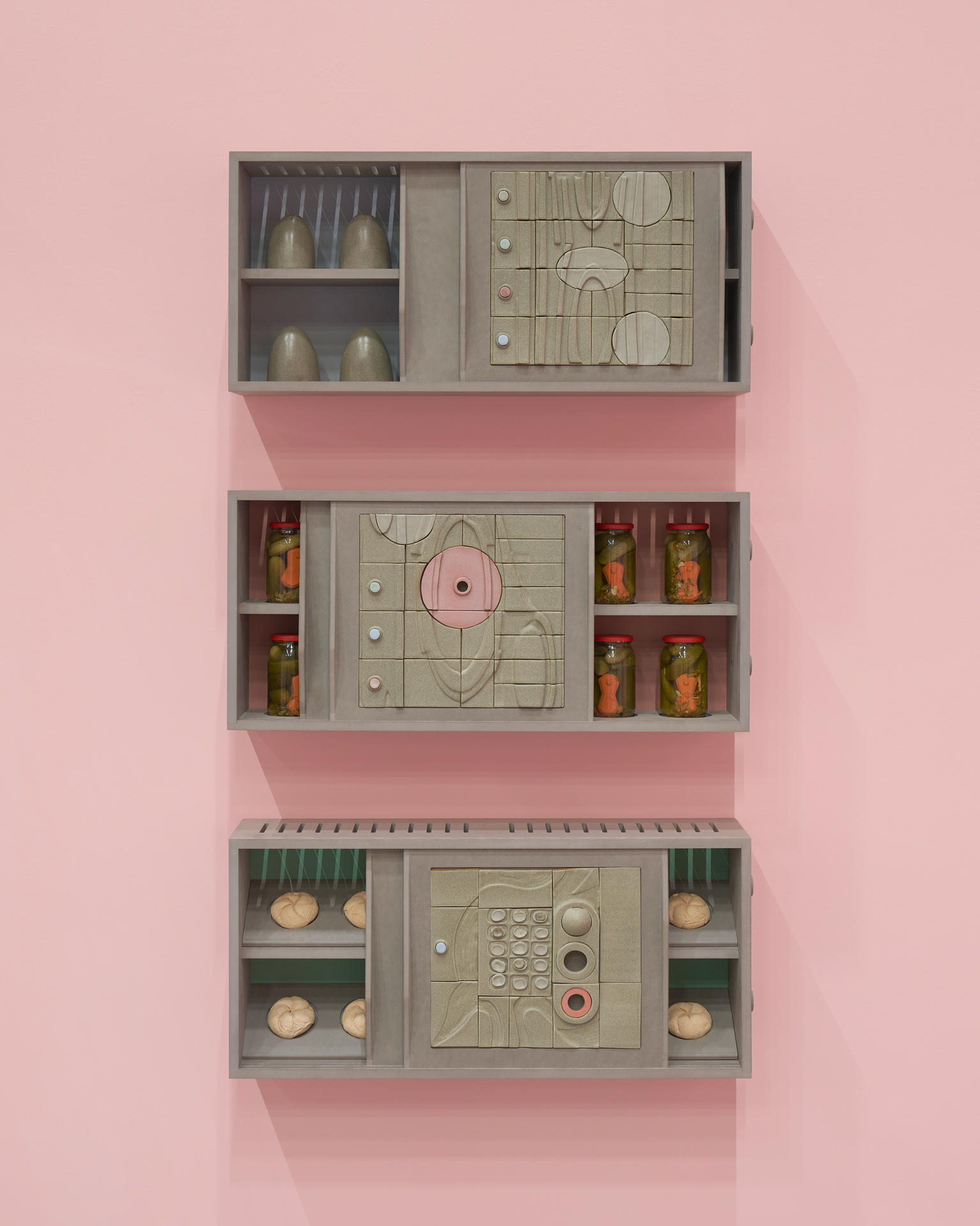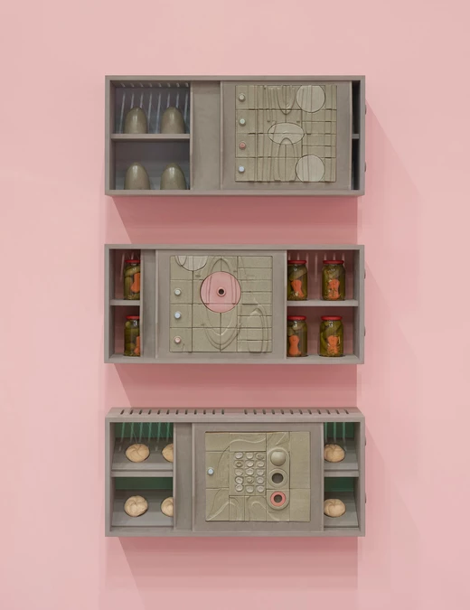Rafał Zajko, "Kredens I, II, III", 2025, płyta Velchromat, płyta Medite, ceramika kamionkowa, słoje, ogórki konserwowe, biożywica, wosk, brąz*. Fot. Tomasz Koszewnik