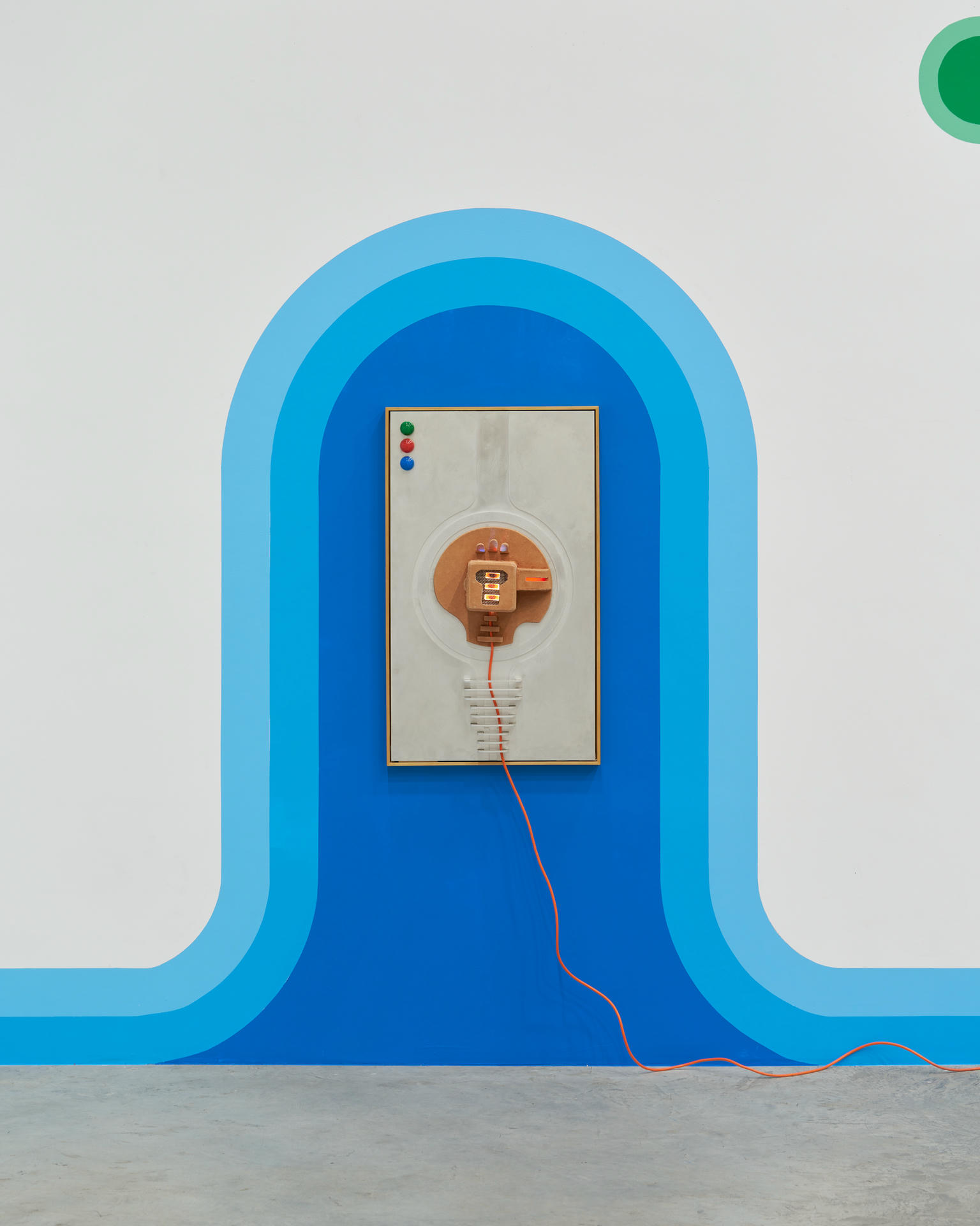 Rafał Zajko, "Syrena VII (Hełm)", 2022, rama z drewna bukowego, aluminium, szkło, terakota, folia akrylowa, polimer barwiony, siatka stalowa, oświetlenie, kabel elektryczny. Fot. Tomasz Koszewnik
