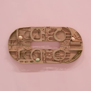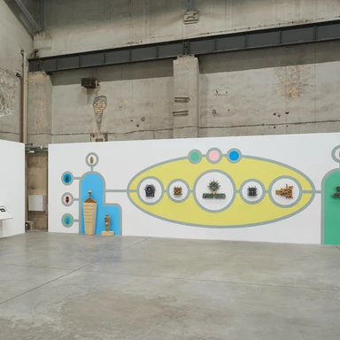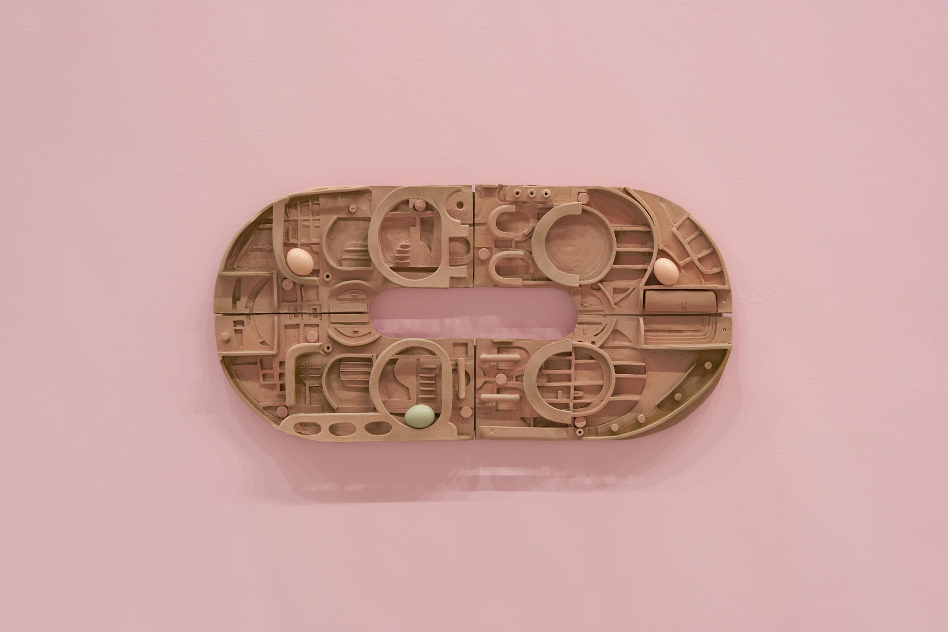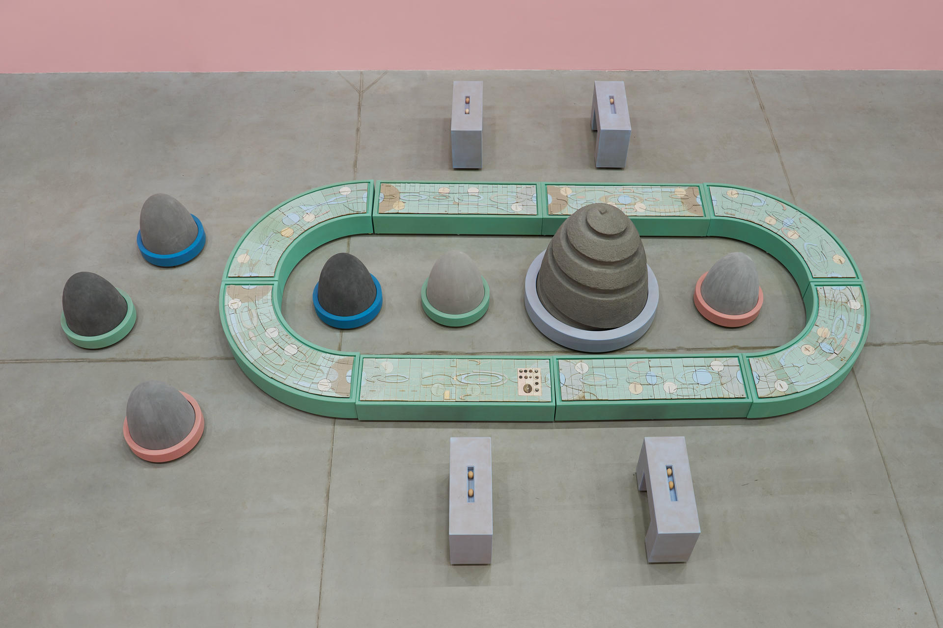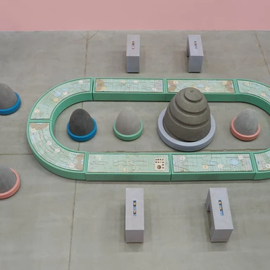 Rafał Zajko, "Funny Games", 2025, woskowana płyta Medite, koła, akrylowy komponent betonowy, ceramika kamionkowa*. Fot. Tomasz Koszewnik