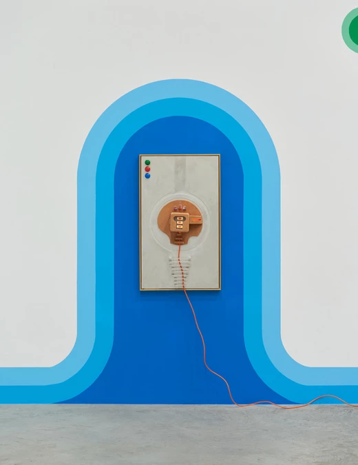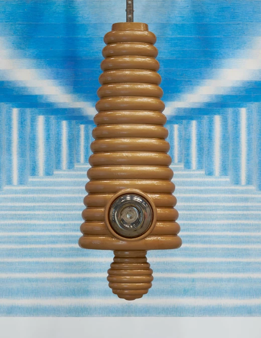 Zdjęcie główne: Rafał Zajko, "Syrena VII (Hełm)", 2022, rama z drewna bukowego, aluminium, szkło, terakota, folia akrylowa, polimer barwiony, siatka stalowa, oświetlenie, kabel elektryczny. Fot. Tomasz Koszewnik