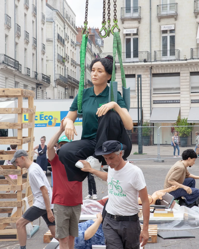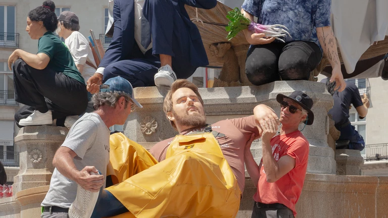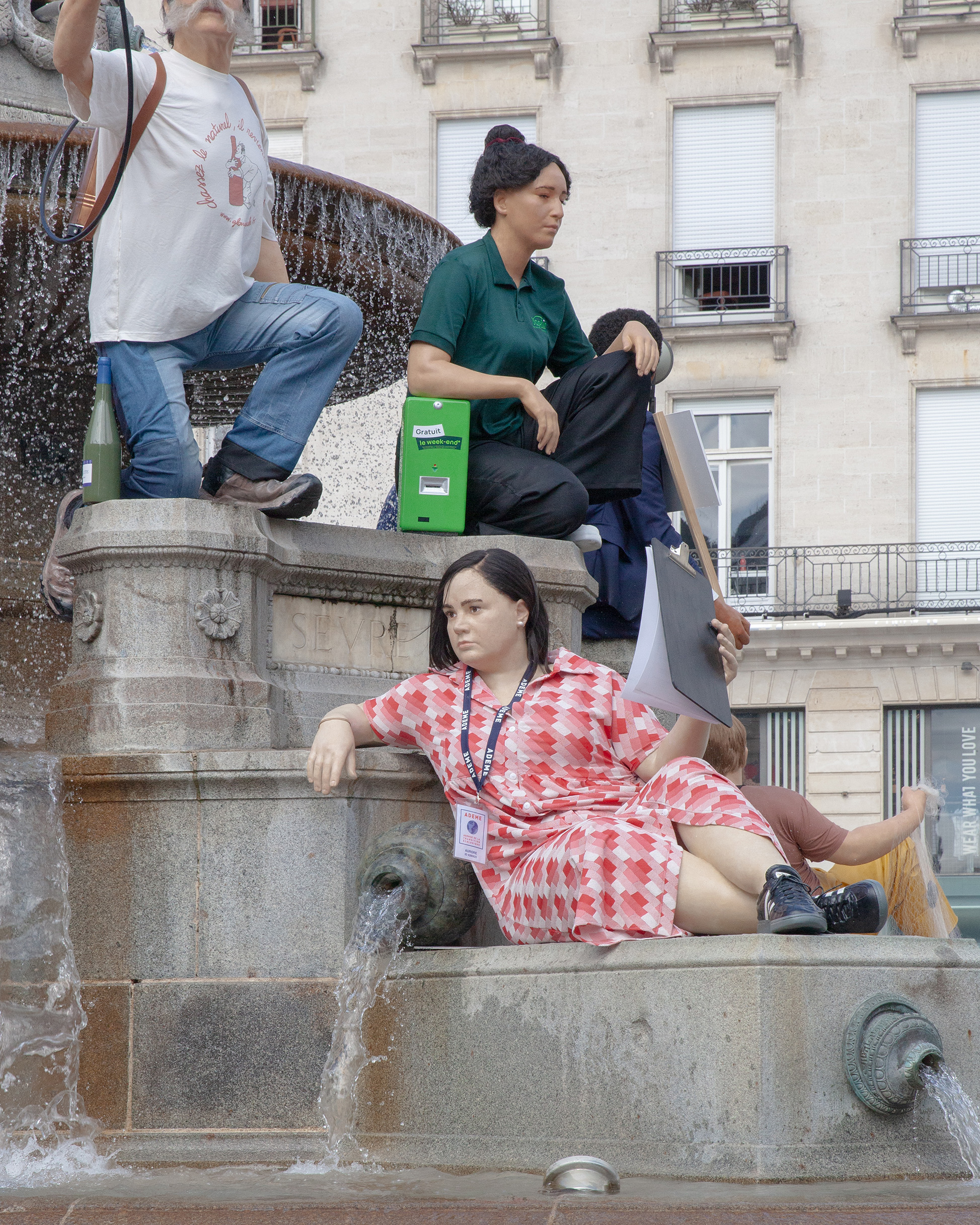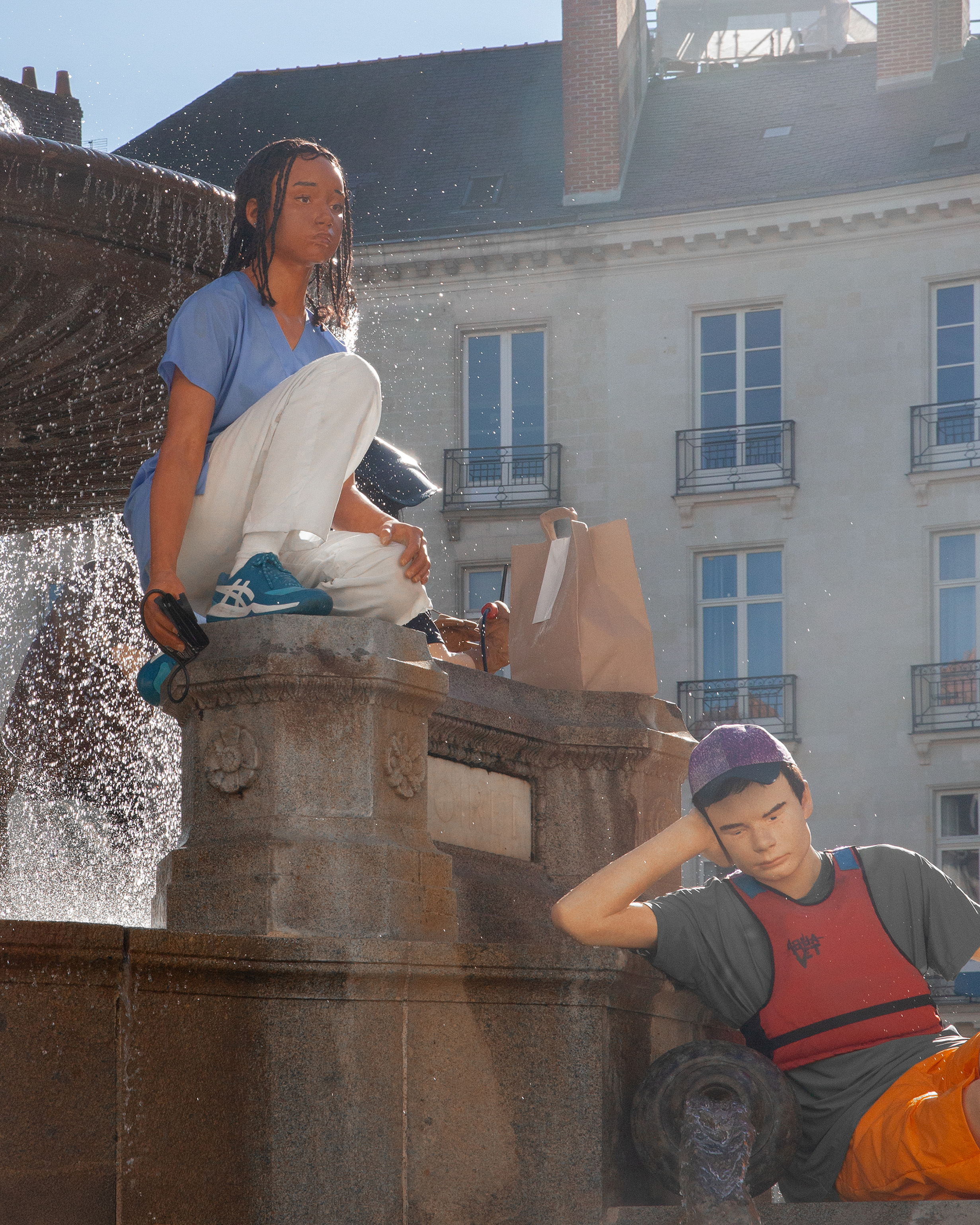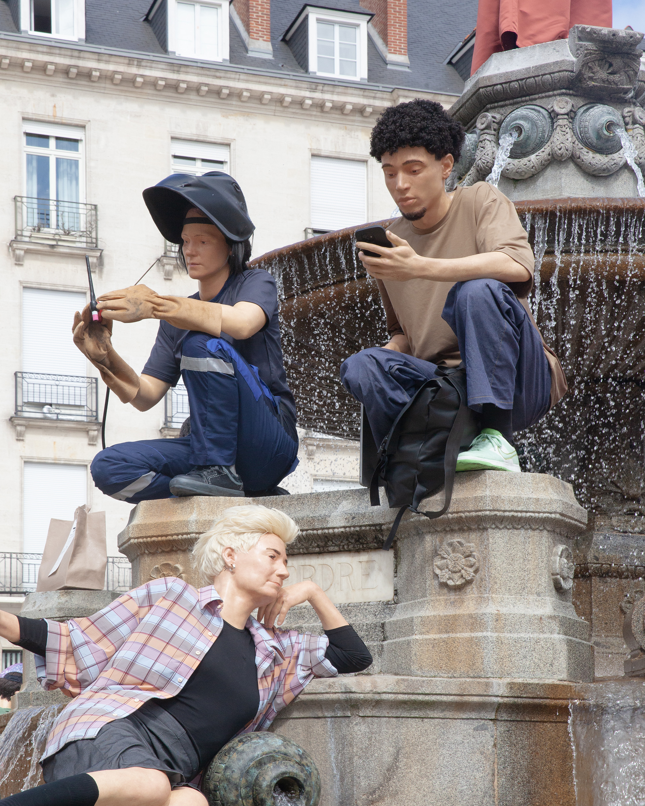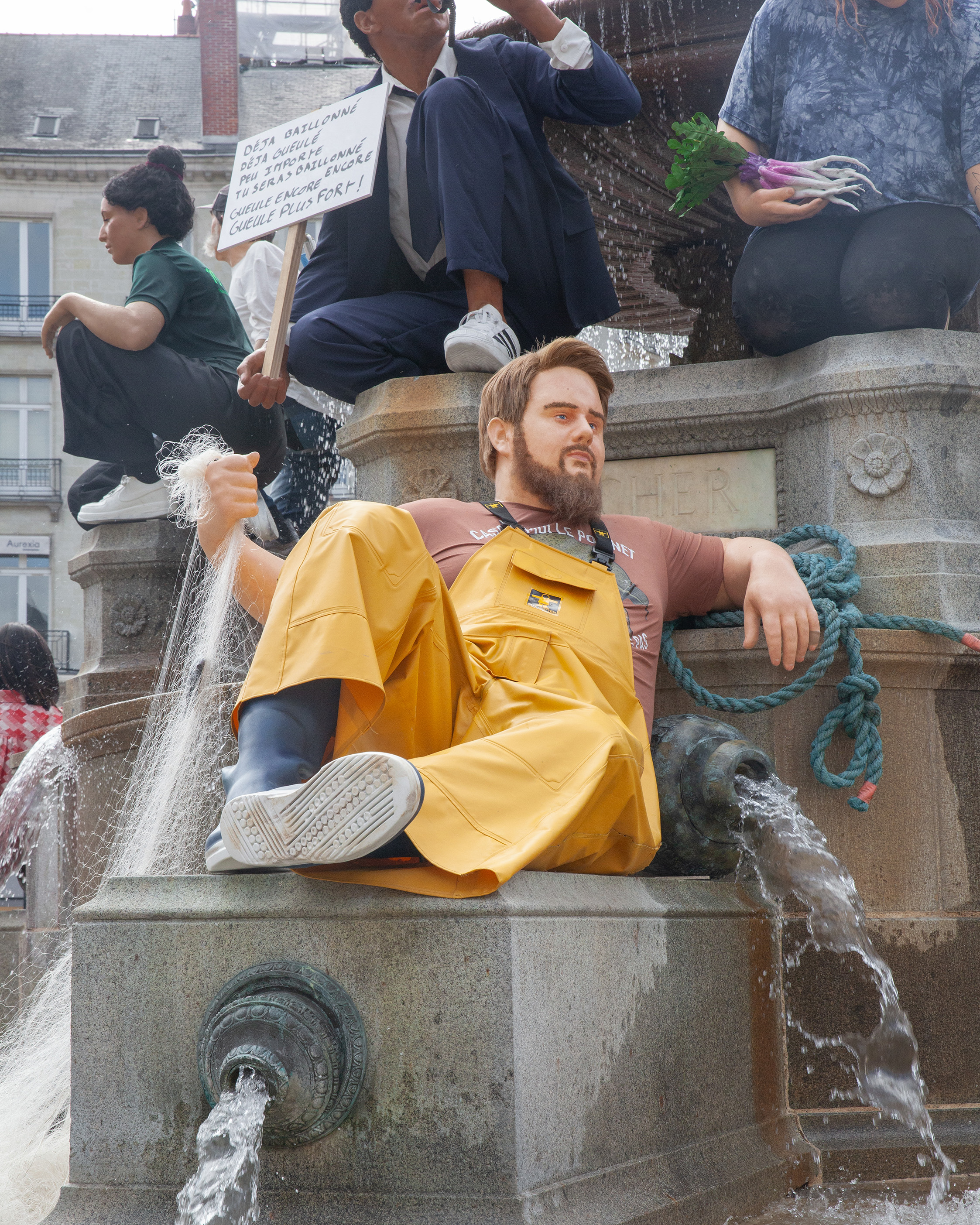 Widzimy tu mężczyznę myjącego cokół, kobietę odpoczywającą z torbą zakupów, postać z transparentem czy turystę. Zamiast patetycznej alegorii miasta czy rzeki, otrzymujemy scenę rodzajową wyniesioną do rangi sztuki wysokiej. De Haan bawi się tu konwencją pomnika – zazwyczaj zarezerwowanego dla bohaterów i bogów – oddając go w ręce (i pod nogi) zwykłego przechodnia. To, co na pierwszy rzut oka wygląda na absurdalny żart, po chwili staje się trafnym komentarzem na temat tego, kogo i co cenimy w przestrzeni publicznej.