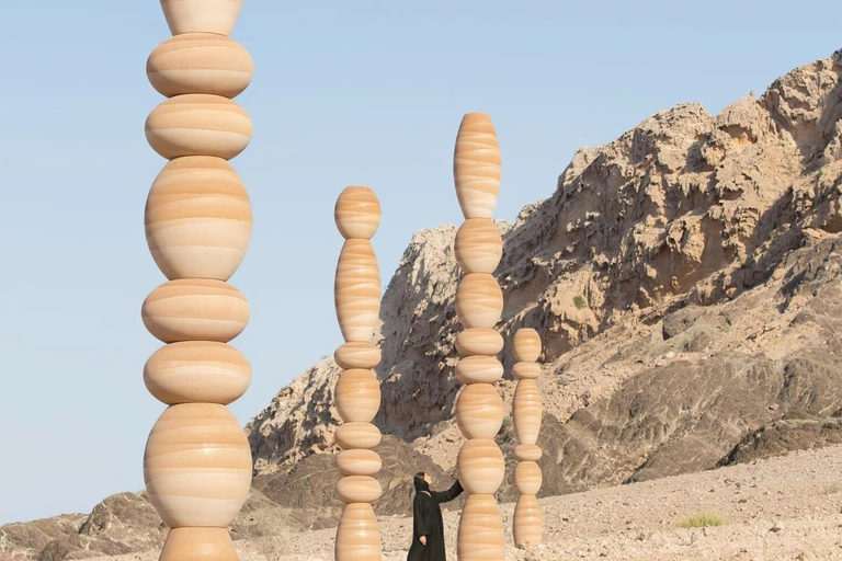 Nowa instalacja „The Desert Relics”, stworzona przez studio Karim & Elias na obszarze 3,850 m2, wizualnie odtwarza proces odkopywania artefaktów. To artystyczna interpretacja przeszłości, osadzona w surowym pustynnym krajobrazie. Dwanaście monumentalnych totemów, wykonanych w całości z ziemi, nawiązuje formą do starożytnych naczyń. Ich geometryczne kształty przypominają stosy ceramicznych waz, bogato zdobiony naszyjnik z klejnotami lub zestaw starożytnych kamieni, odwołując się do różnorodnych znalezisk z Mleiha.