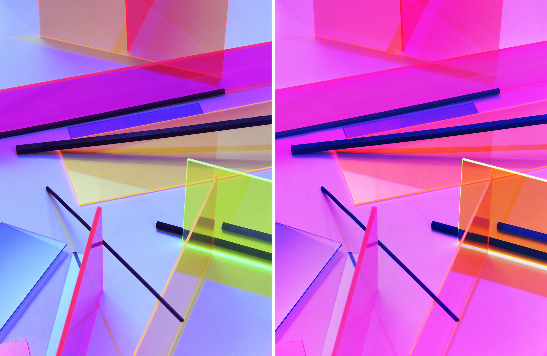 Barbara Kasten, Dyptyk kompozycja 1T – 1E, 2017. Dzięki uprzejmości artystki oraz Kadel Willborn, Düsseldorf; Bortolami, New York, NY; Thomas Dane gallery, London, UK