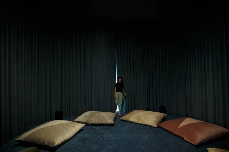 Instalacja Karoliny Grzywnowicz w Zamku Ujazdowskim ma formę symbolicznego namiotu. Ponad 100 metrów granatowego weluru Spring Navy pozwoliło wykreować intymną przestrzeń, w której można zasiąść na wielkich poduszkach, uszytych przez markę Miuki z tkanin Spring i Jason.