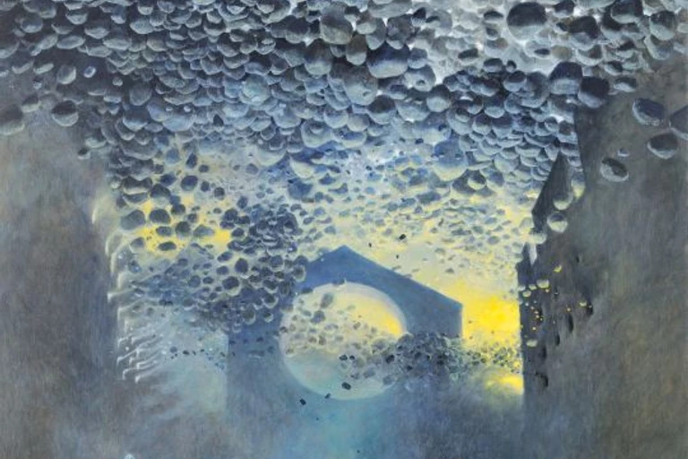 jest mistyczno-fantastyczna, otwarta konstrukcja ścian i murów zniszczonego panteonu lub świątyni z grupą sylwetek w barwnych uniformach, a z rozświetlonego słońcem nieboskłonu spada na nie kaskada kamieni jak z rozbitego na cząstki kosmicznego meteorytu (AC80).