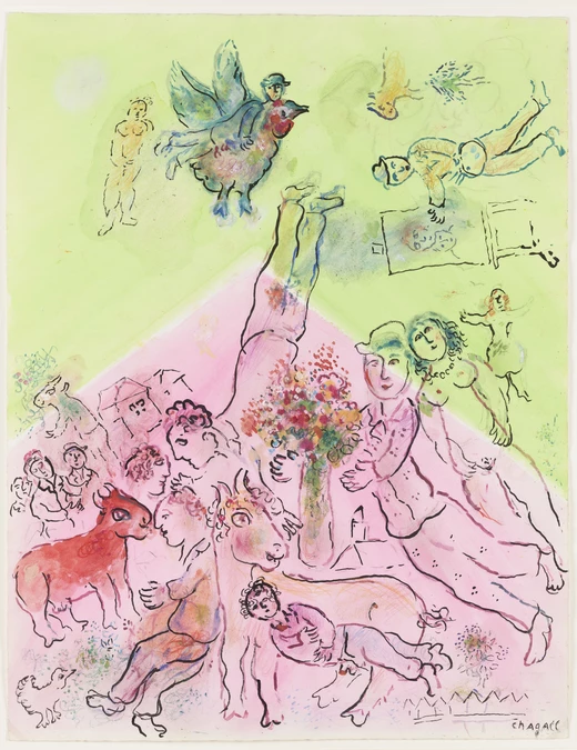 Prace zakupione przez Muzeum w 2021 roku to przykłady dojrzałej twórczości artysty. Powstały w latach 60. i 70. XX wieku, w okresie rozkwitu rysunku i grafiki w zachodniej Europie. Reprezentują różnorodne techniki: gwasz, temperę, kredkę, ołówek i kolorowy tusz, a nawet pastel. Widzowie odnajdą w nich charakterystyczne motywy sztuki Chagalla: sceny biblijne (osobliwie, indywidualnie zinterpretowane), pary zakochanych, bukiety kwiatów, zwierzęta. Pojawiają się także nawiązania do dzieciństwa artysty, kilka rysunków jest poświęconych uczuciom łączącym go z rodziną. Dzieła zachwycają żywą kolorystyką oraz niezwykłą oniryczną atmosferą, łączącą elementy rzeczywiste z fantastycznymi. Prezentujemy również dwie wczesne prace Chagalla, pozostające w zbiorach MNW od lat 70. XX wieku – ilustracje do autobiografii artysty Moje życie oraz do Martwych dusz Mikołaja Gogola, wykonane w technice suchej igły i akwaforty.