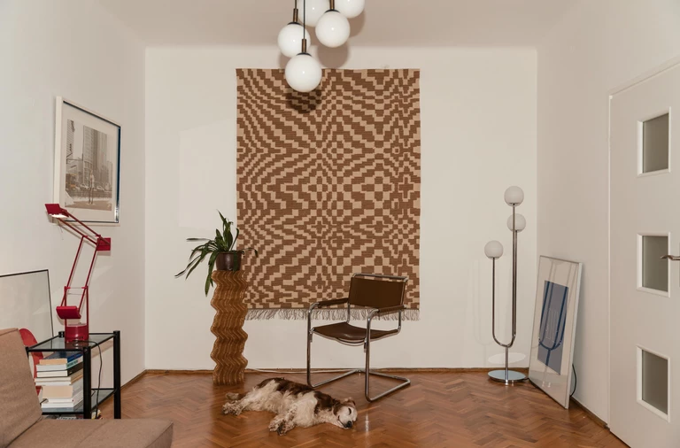 Jaki kilim projektant Edgar Bąk chciałby mieć u siebie w domu? Właśnie z tego pytania, zadanego sobie przez artystę, w 2025 roku powstał kilim „Obłędny” zaprojektowany dla Splotu. Efektem jest hipnotyczna, op-artowa kompozycja utrzymana w łagodnej, beżowej kolorystyce. Tkanina została w całości wykonana ręcznie w Bobowej, z ręcznie przędzionej wełny, na lnianej osnowie.
