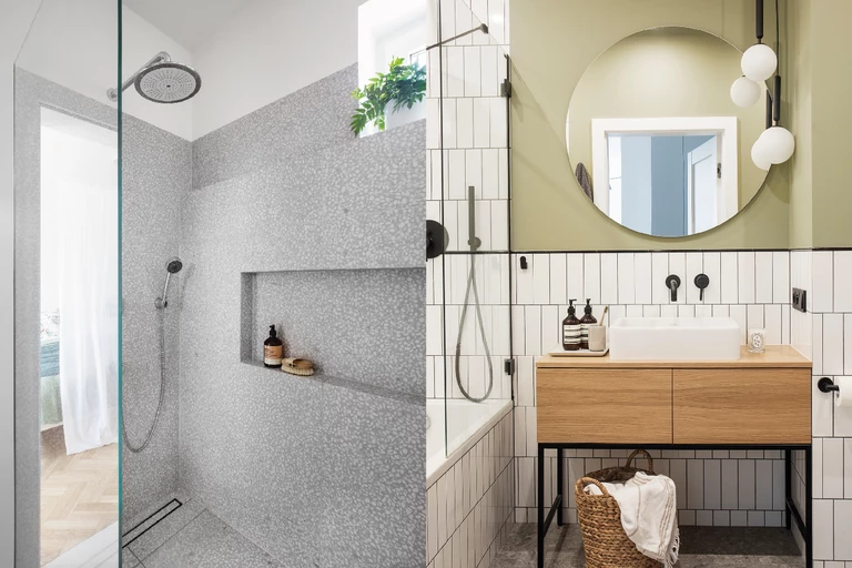 W przypadku tego mieszkania kosztem sypialni powiększono łazienkę. Dzięki temu zabiegowi znalazło się miejsce na pralkę, która została ukryta w niewidocznej zabudowie, a łazienka stała się bardziej przestrzenna. Oliwkowy kolor ścian połączony z drewnem, bielą i czarną armaturą łazienkową tworzą przyjemny miks.