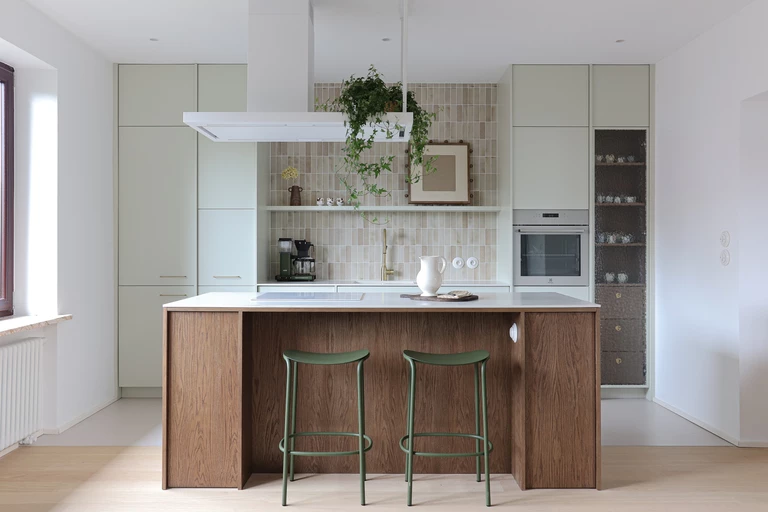 Apartament znajduje się w jednej ze starych kamienic otoczonych wiekowym drzewostanem. Jak wyjaśnia Gabriela Bartczak Gabriela Bartczak – Pruszyńska, zależało jej na tym, by wnętrze korespondowało z otoczeniem. Dlatego znajdziemy w nim naturalne, ciepłe drewno w wielu odcieniach, zieleń oraz beże.