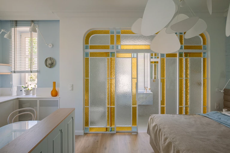 Z pewnością elementem, który wyróżnia tę przestrzeń spośród oferty podobnych tego typu miejsc, jest przeszklona ściana i drzwi do łazienki wykonane z kolorowego szkła ornamentowego. Kompozycja z niebieskiego, miodowego i białego szkła robi „efekt wow” w tym wnętrzu. Ale nie tylko estetyka była tu ważna – to rozwiązanie pozwoliło doświetlić wnętrze i wpuścić do części dziennej piękne, kolorowe refleksy światła.