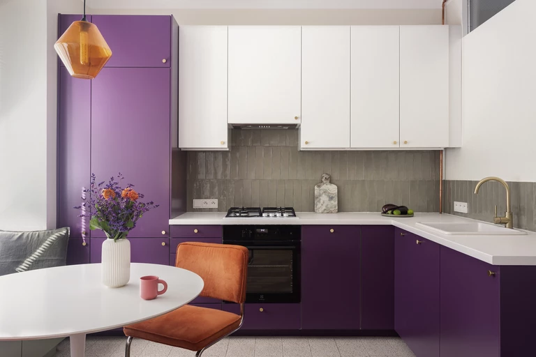 34-metrowe mieszkanie pełne uroku. Jego sercem jest fioletowa kuchnia