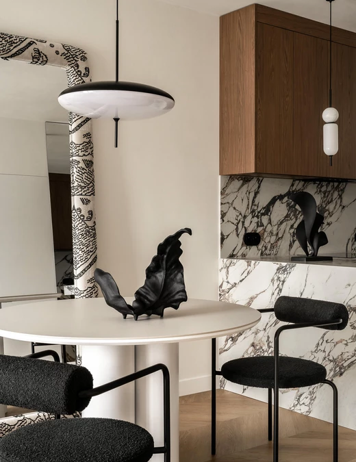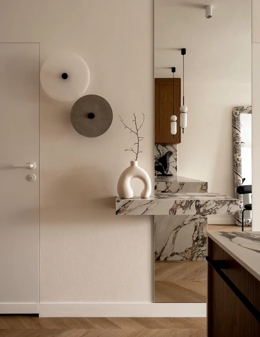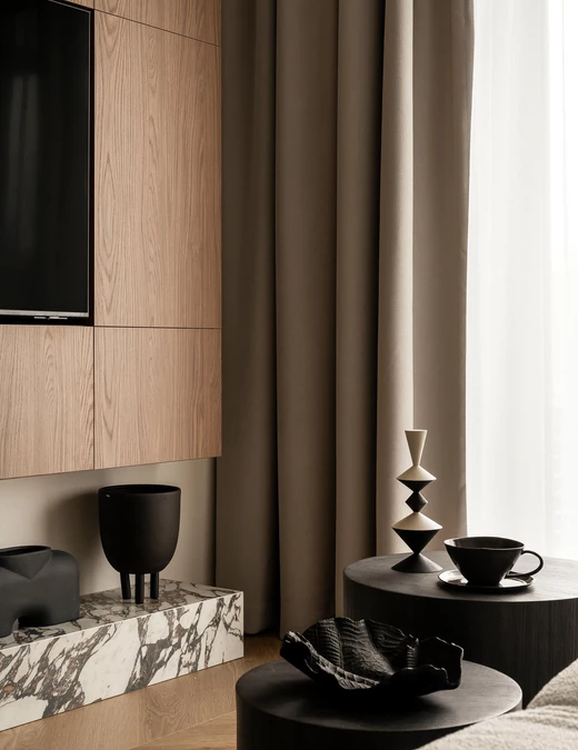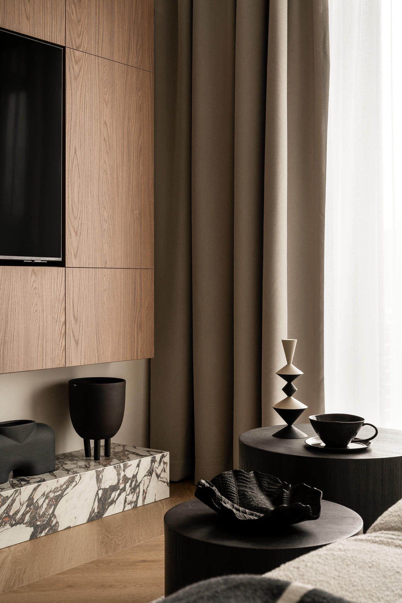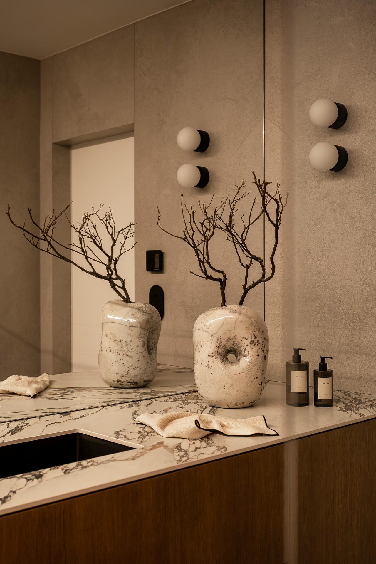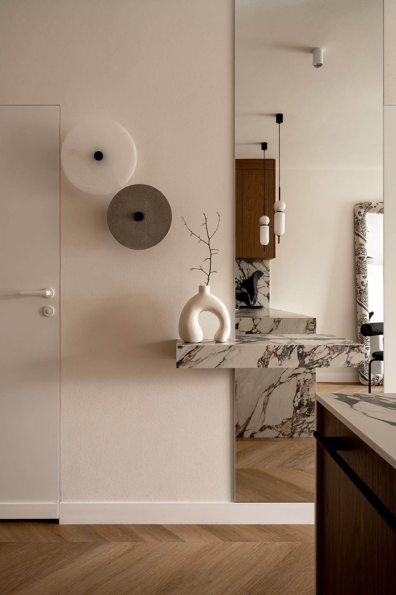 Najważniejszym elementem mieszkania pozostaje światło. Rano ociepla neutralne powierzchnie i wydobywa strukturę drewna, w południe podkreśla graficzną linię kamienia, a wieczorem mięknie w przygaszonym blasku lamp, tworząc scenografię dla domowych rytuałów – kolacji, lektury czy rozmowy.