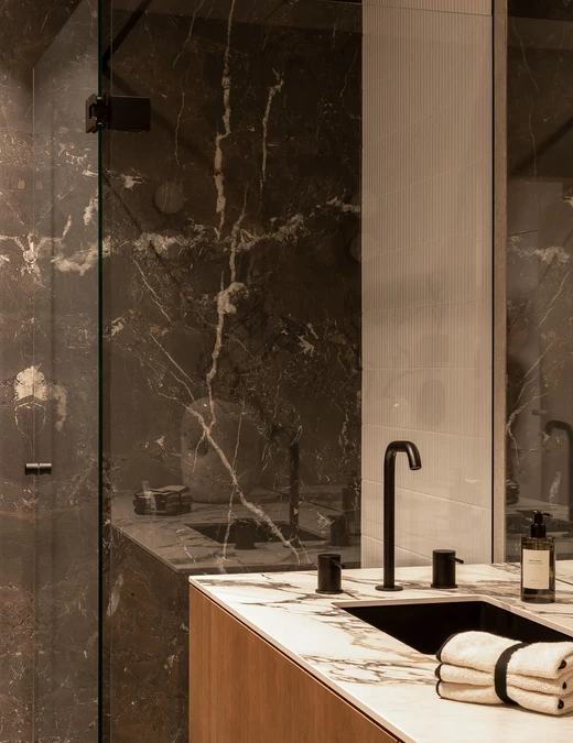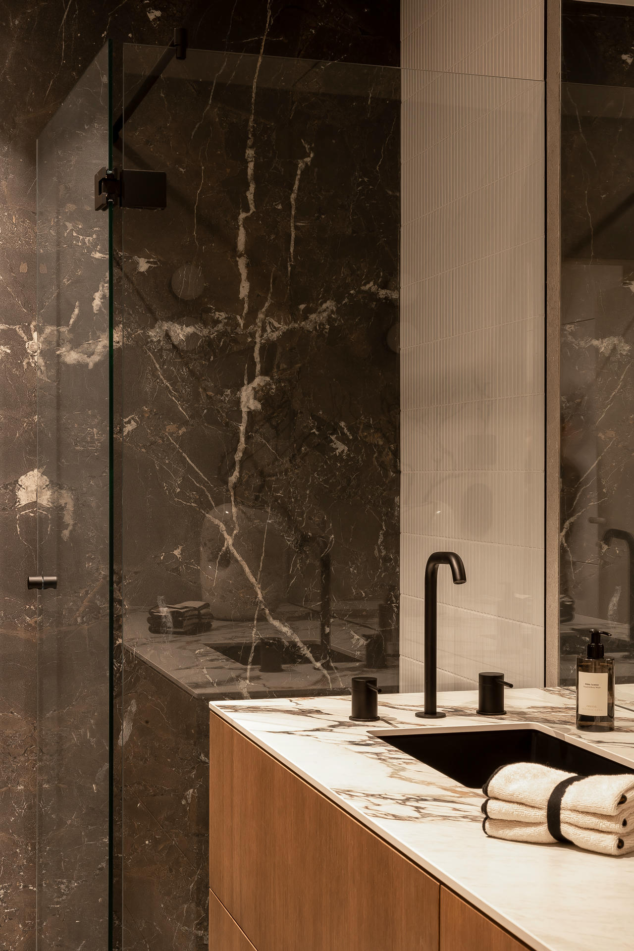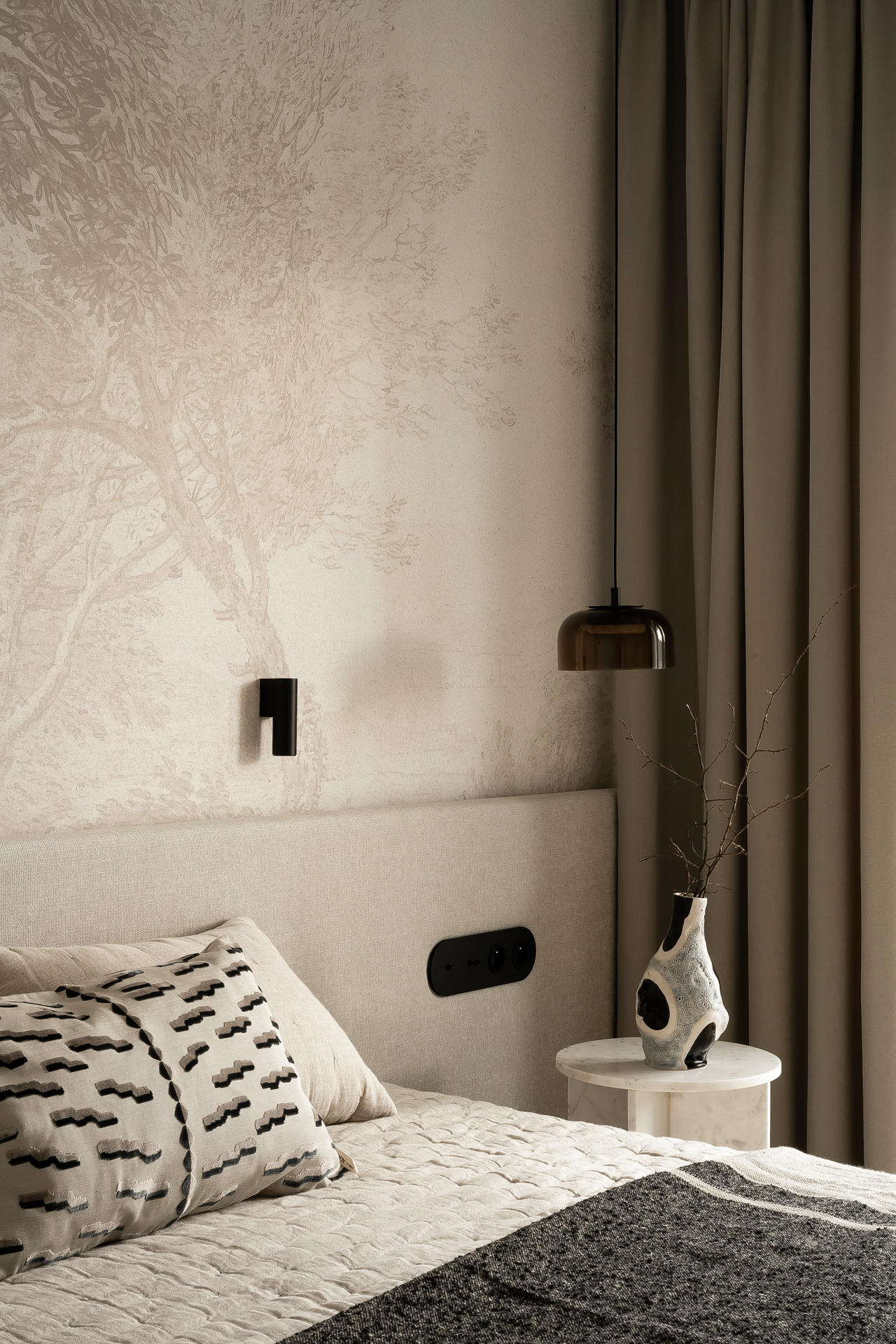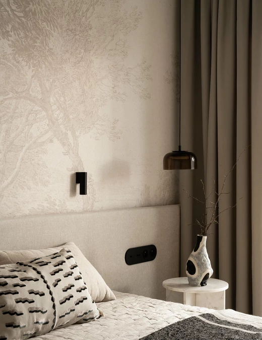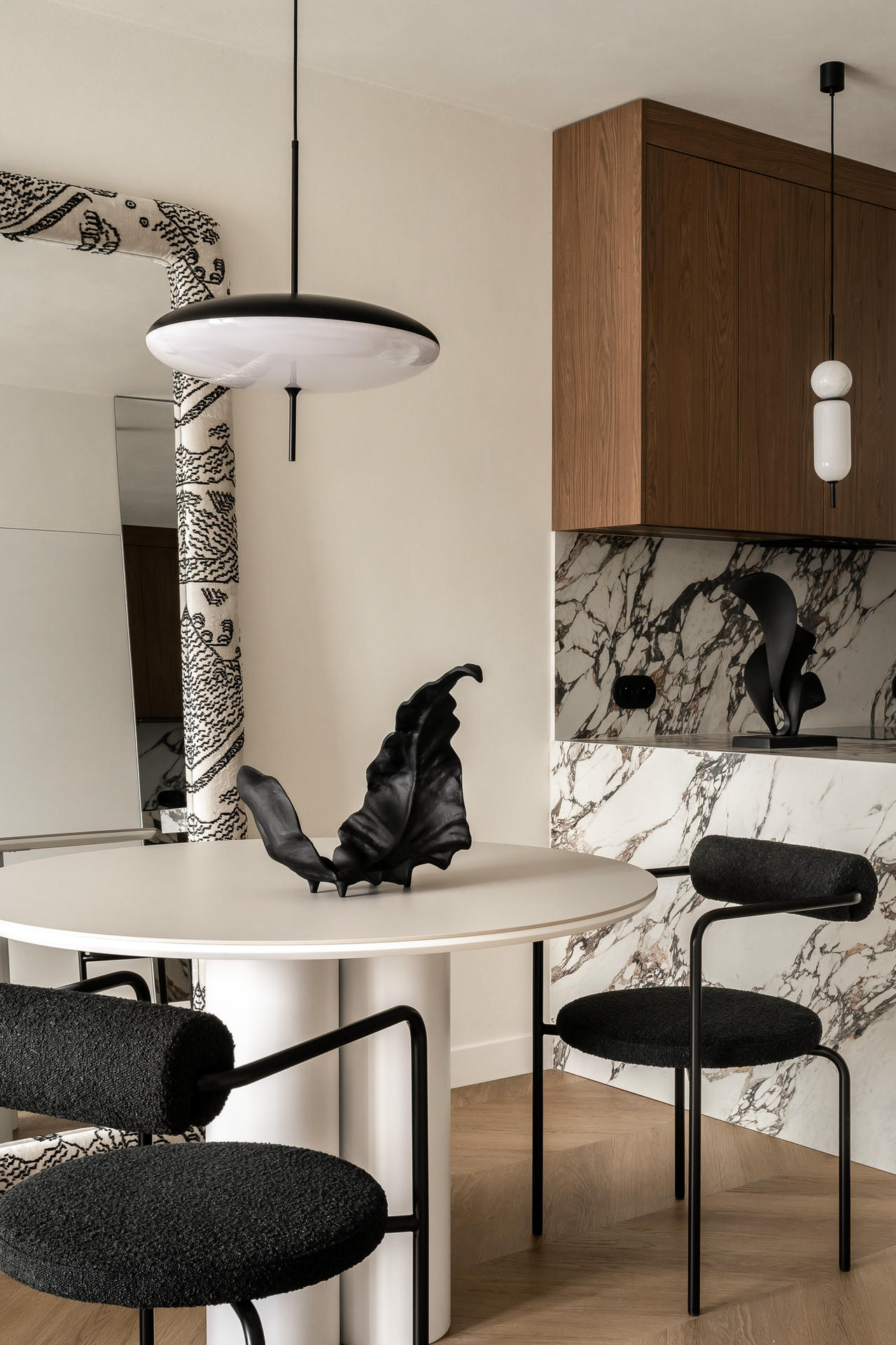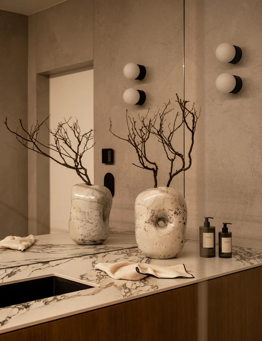 Najważniejszym elementem mieszkania pozostaje światło. Rano ociepla neutralne powierzchnie i wydobywa strukturę drewna, w południe podkreśla graficzną linię kamienia, a wieczorem mięknie w przygaszonym blasku lamp, tworząc scenografię dla domowych rytuałów – kolacji, lektury czy rozmowy.