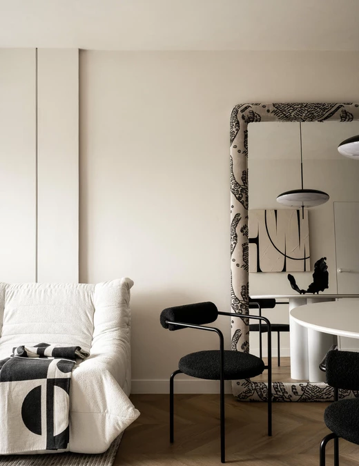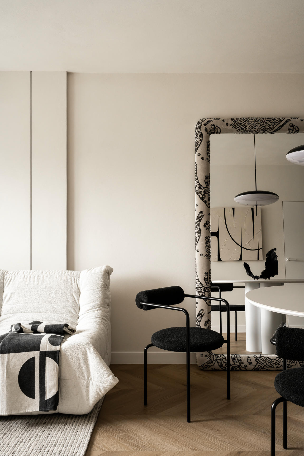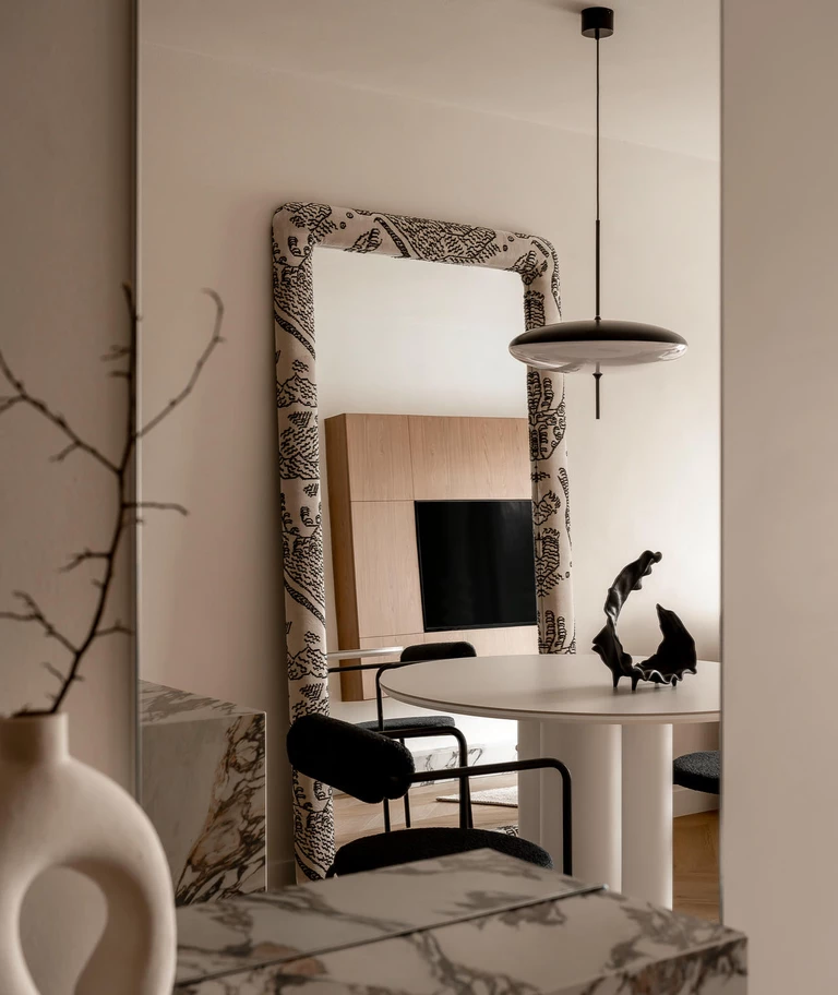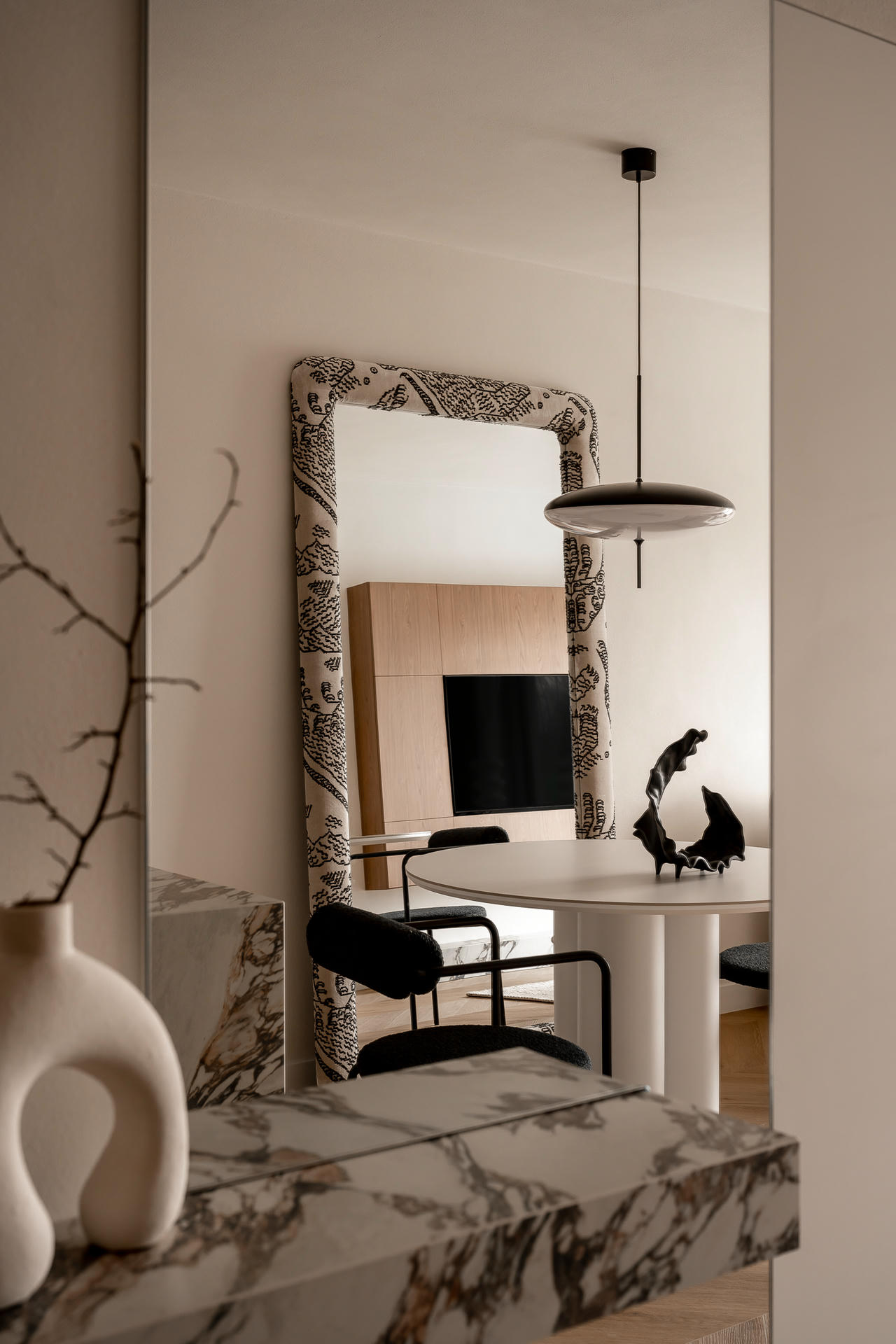 Znakiem autorskim projektu stało się specjalnie stworzone lustro o rzeźbiarskiej formie. Jego miękka linia i tkaninowa rama multiplikują światło, otwierają perspektywę i wprowadzają element osobisty. To przedmiot, który równie dobrze mógłby wisieć w galerii, a tutaj staje się częścią codzienności.