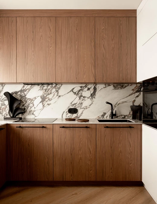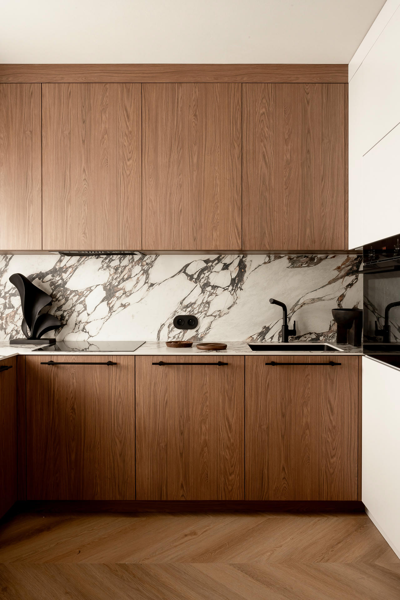 Zamiast mnożenia dekoracji i form projekt oparto na ciszy materiałów, rozumianej jako klasyczna prostota i kojąca naturalność. Projektantka wykorzystała ciepłe drewno, piaskowe odcienie ścian, naturalne tkaniny oraz blat z kamienia o wyraźnym użyleniu, który pracuje ze światłem. Każdy z tych elementów nie tylko wypełnia przestrzeń, ale zaprasza do jej doświadczania.