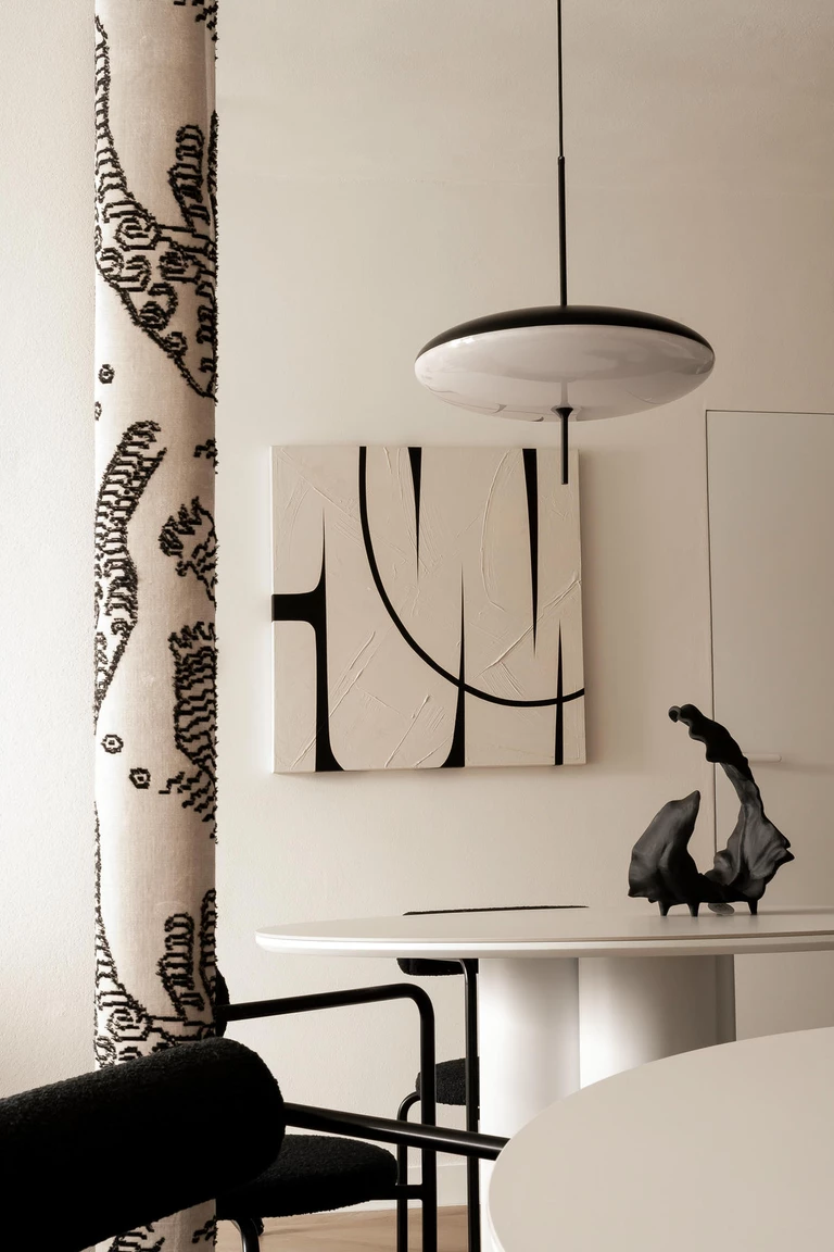 Na jednej ze ścian pojawia się obraz Evy Jablonsky – abstrakcyjny, lecz miękki w odbiorze i rezonujący z paletą wnętrza. Jego obecność działa jak kolejny głos w tej opowieści: subtelny, ale niezbędny, dopowiada historię zamiast ją zagłuszać.