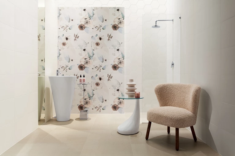 Wzór kwiatowy jako motyw dekoracyjny wykracza już poza pojedyncze zdobienia – jest traktowany bardziej jak pełnoprawny fragment przestrzeni. Pasuje zarówno do wnętrz w stylu glamour, jak i nowoczesnych loftów, i sprawdza się w różnorodnej estetyce – od stylu prowansalskiego aż po wyrafinowany angielski. Płytki z motywem roślinnym są też dobrą alternatywą dla dekoracji geometrycznych, a niekiedy także ich ciekawym uzupełnieniem. Chcąc uzyskać subtelną kompozycję i wyeksponować motyw kwiatowy, lepiej unikać zagospodarowania całej przestrzeni tego typu dekoracjami i spojrzeć na nie bardziej jak na obraz do wnętrza. To sprawi, że przestrzeń zyska świeżość i oryginalny charakter.