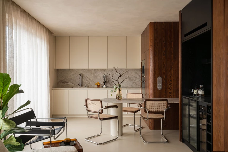Strefy odpoczynku, spożywania posiłku i gotowania przenikają się wzajemnie poprzez wspólną zabudowę stolarską wijącą się po uskokach ściennych. „Zabudowa rysuje kształt otwieranej wnęki barku, po czym miękko przechodzi w formę otaczającą eliptyczny stół, by na samym końcu okryć swoją okładziną urządzenia kuchenne” – opisuje projekt jego autor.