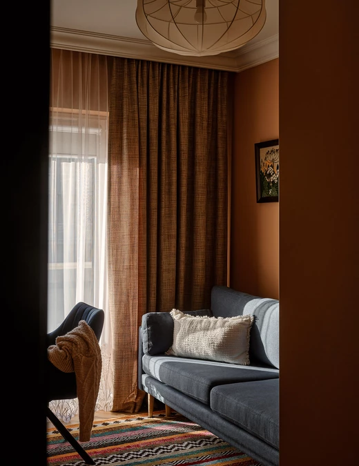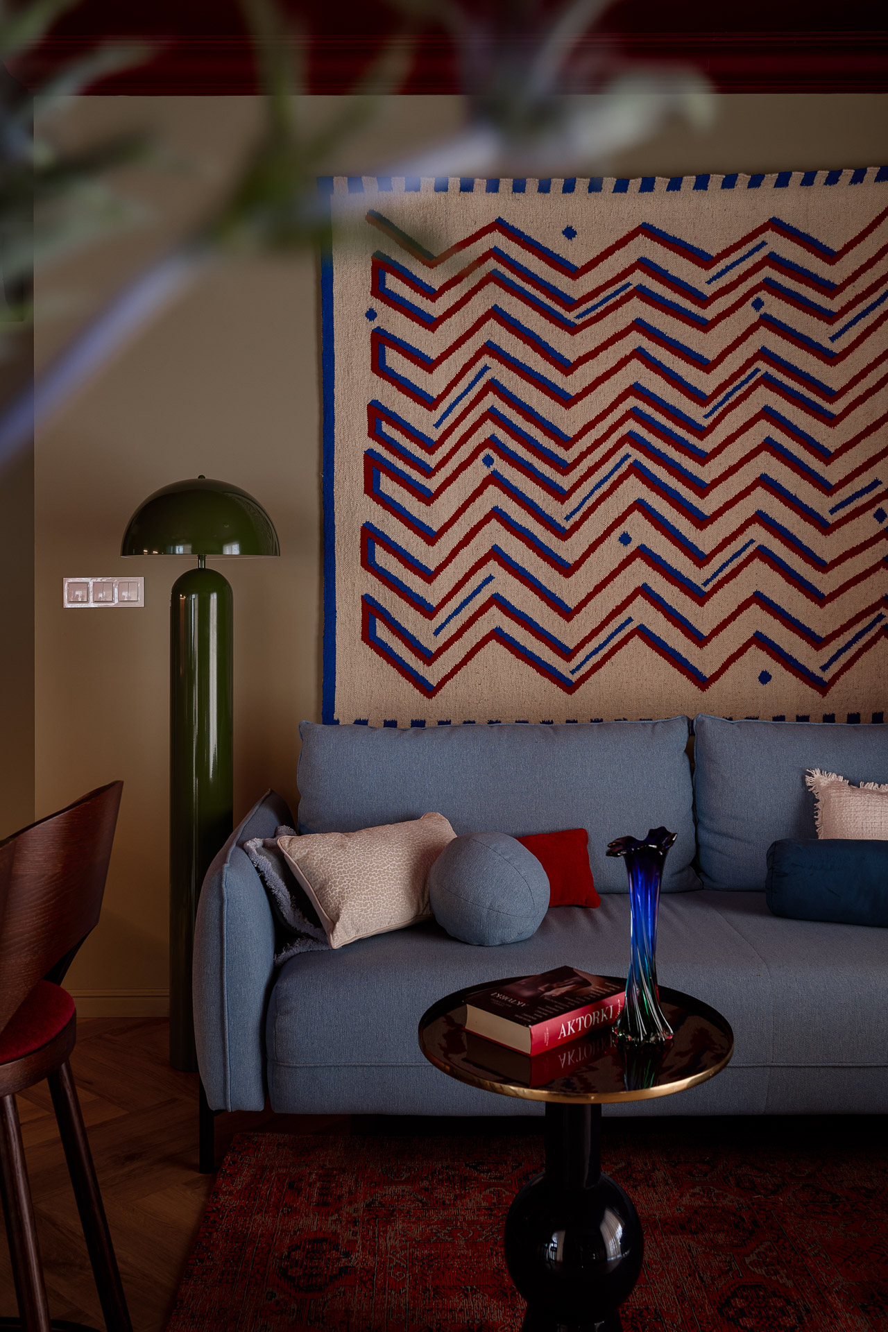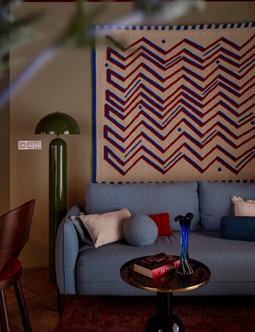 Nad kanapą zawisł kilim od marki SPLOT – wyrazisty tekstylny akcent, który można potraktować jako symboliczne serce mieszkania.
