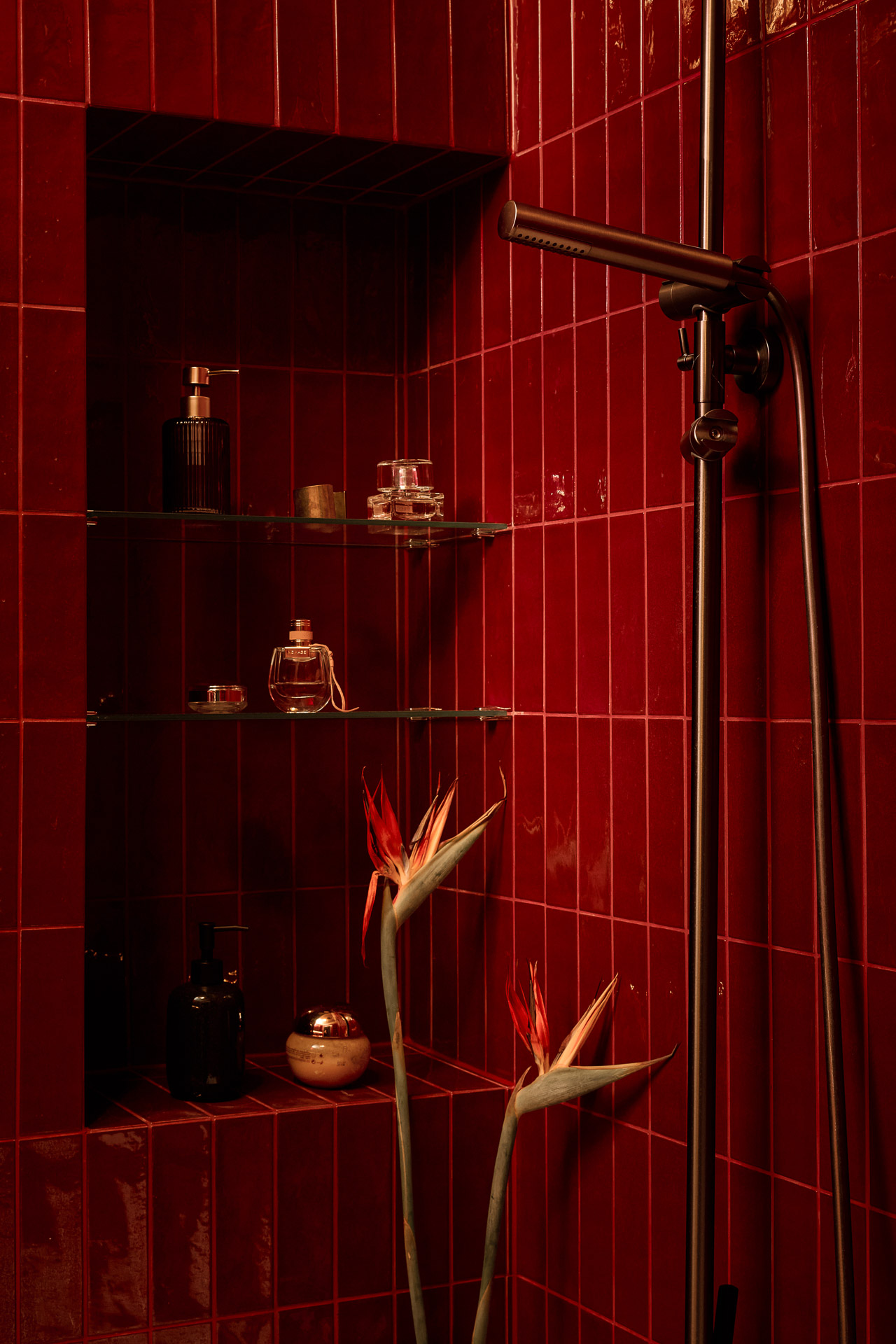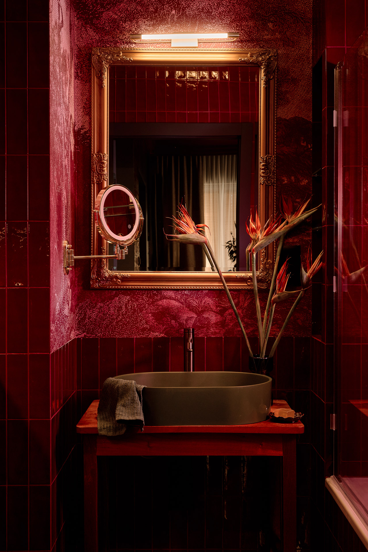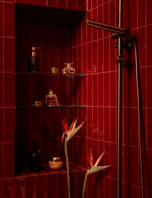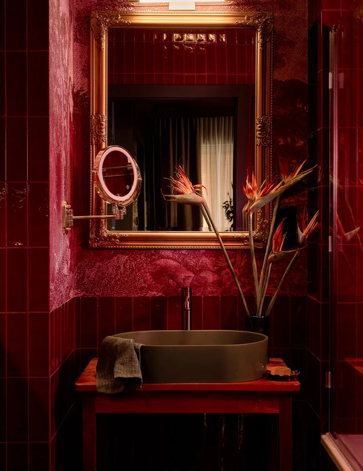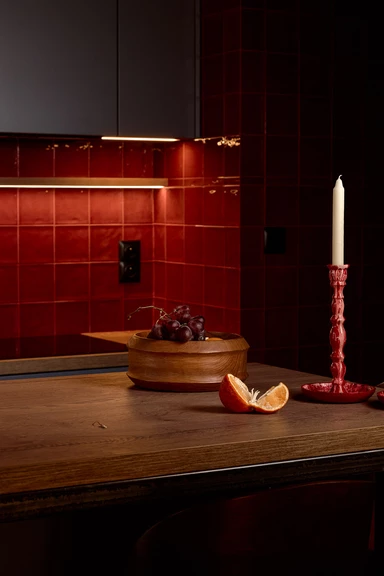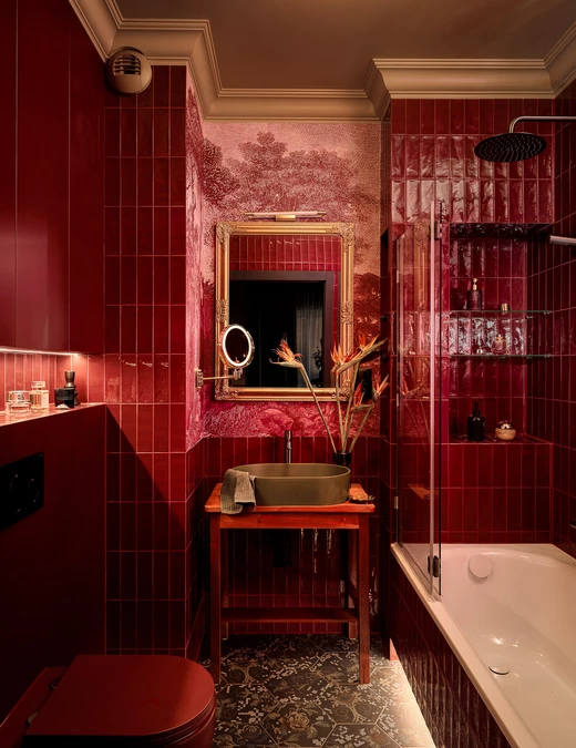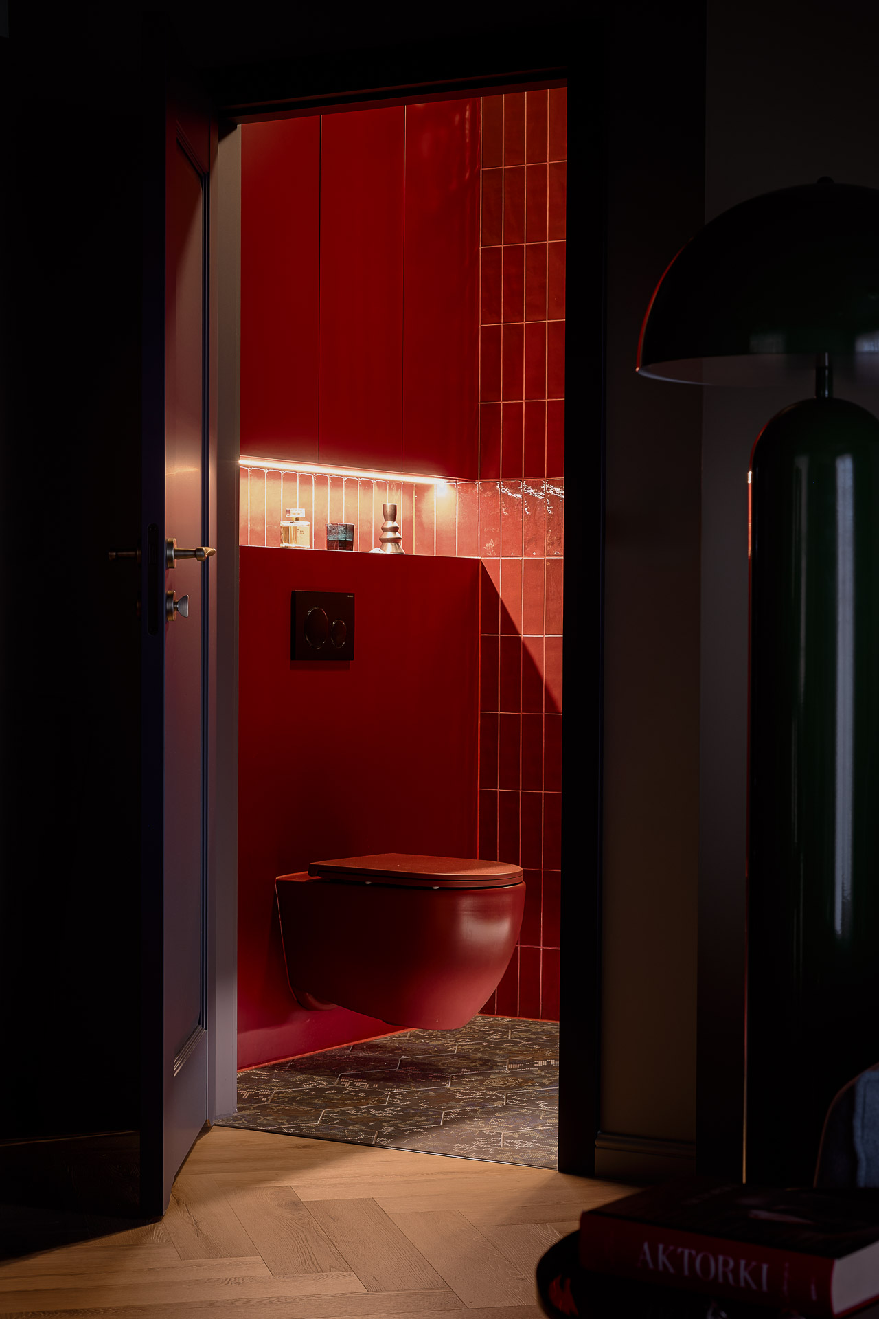 Dominującym kolorem jest głębokie bordo. Pojawia się w różnych częściach wnętrza: od sufitów, przez płytki w kuchni, aż po łazienkę, gdzie zestawiono je z oliwkową zielenią. Nawet wisząca toaleta ma bordowy kolor.