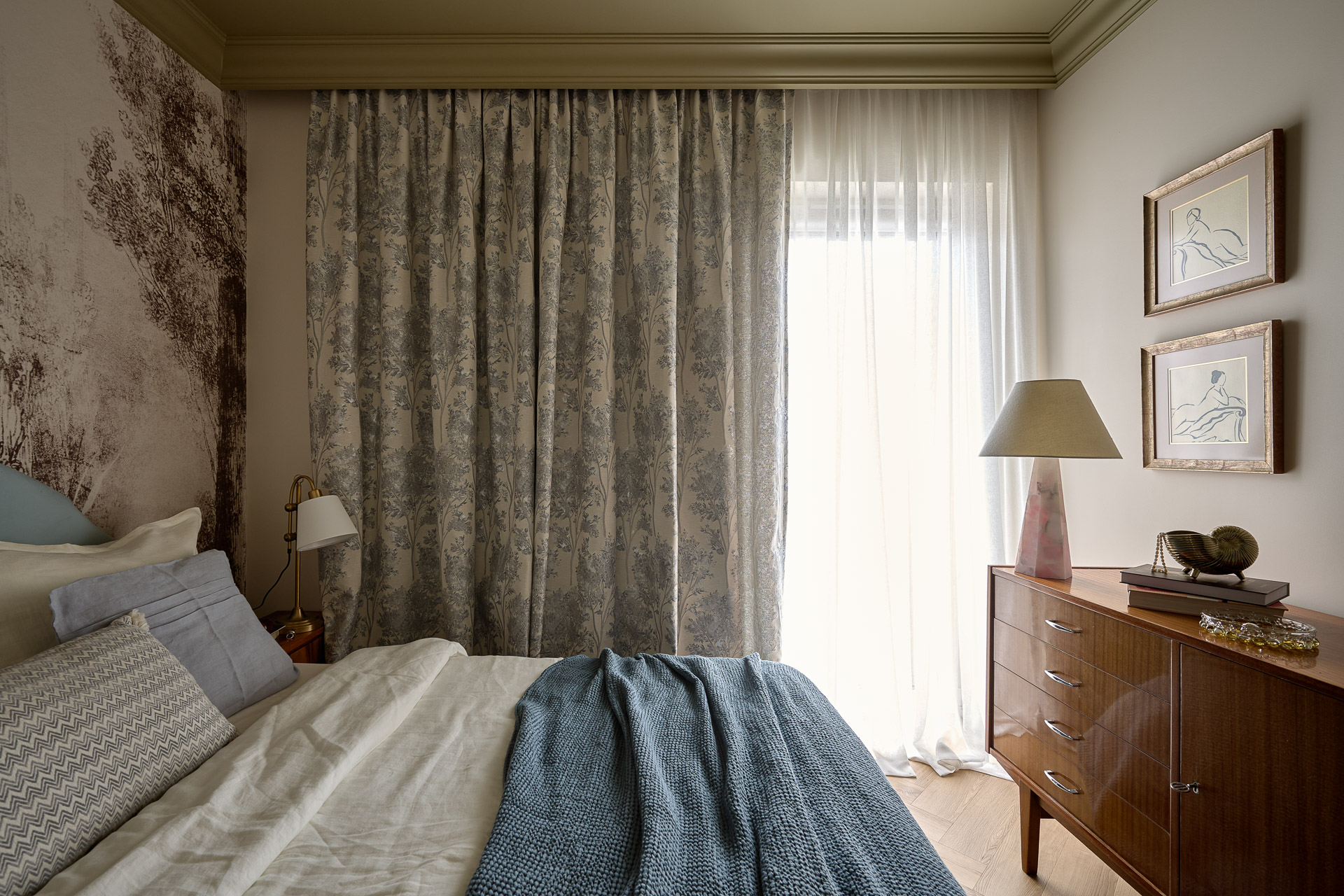 Subtelne sztukaterie porządkują przestrzeń i tworzą wizualną ramę dla całego wnętrza. Całość uzupełniają tapety marki Wall Art oraz zasłony od Eurofirany.