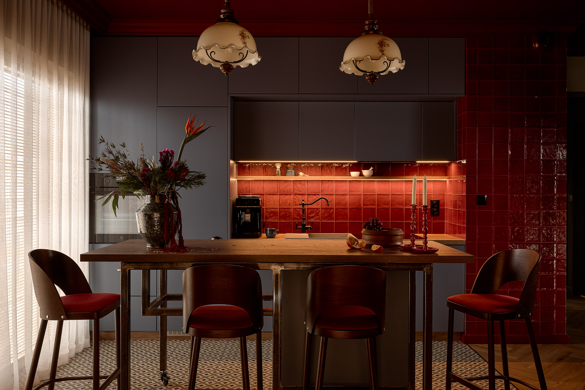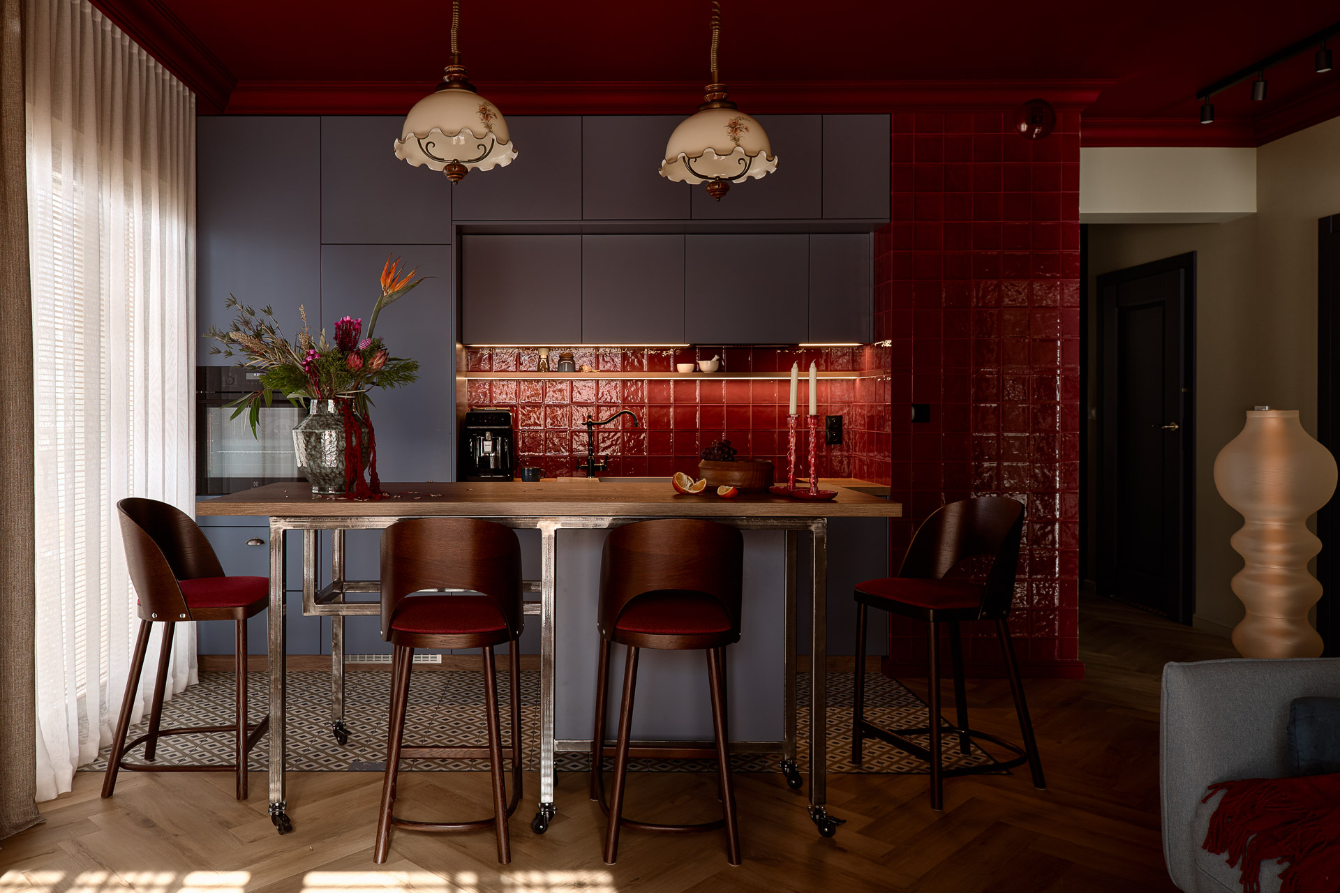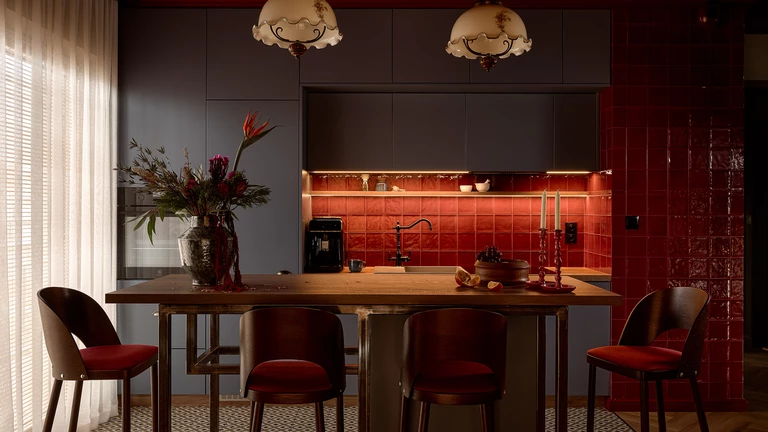 W samej kuchni zestawiono bordowe płytki z frontami zabudowy w niebiesko-szarym odcieniu. Mocna kolorystyka została zrównoważona tak, by mimo odważnych barw całość pozostała harmonijna. Charakter wnętrza podkreślają vintage’owe lampy Murano znalezione na portalu aukcyjnym.