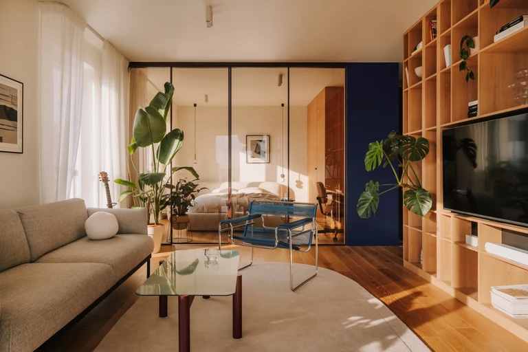 Stojący w środku salon regał zasłania wejście do łazienki, nadając tej przestrzeni prywatność. Sypialnię umiejscowiono za szklaną ścianą z bordowymi drzwiami przesuwnymi, otwierającymi się na salon. Zastosowanie szkła o lekko brązowym zabarwieniu doświetliło zarówno część dzienną, jak i miejsce odpoczynku.
