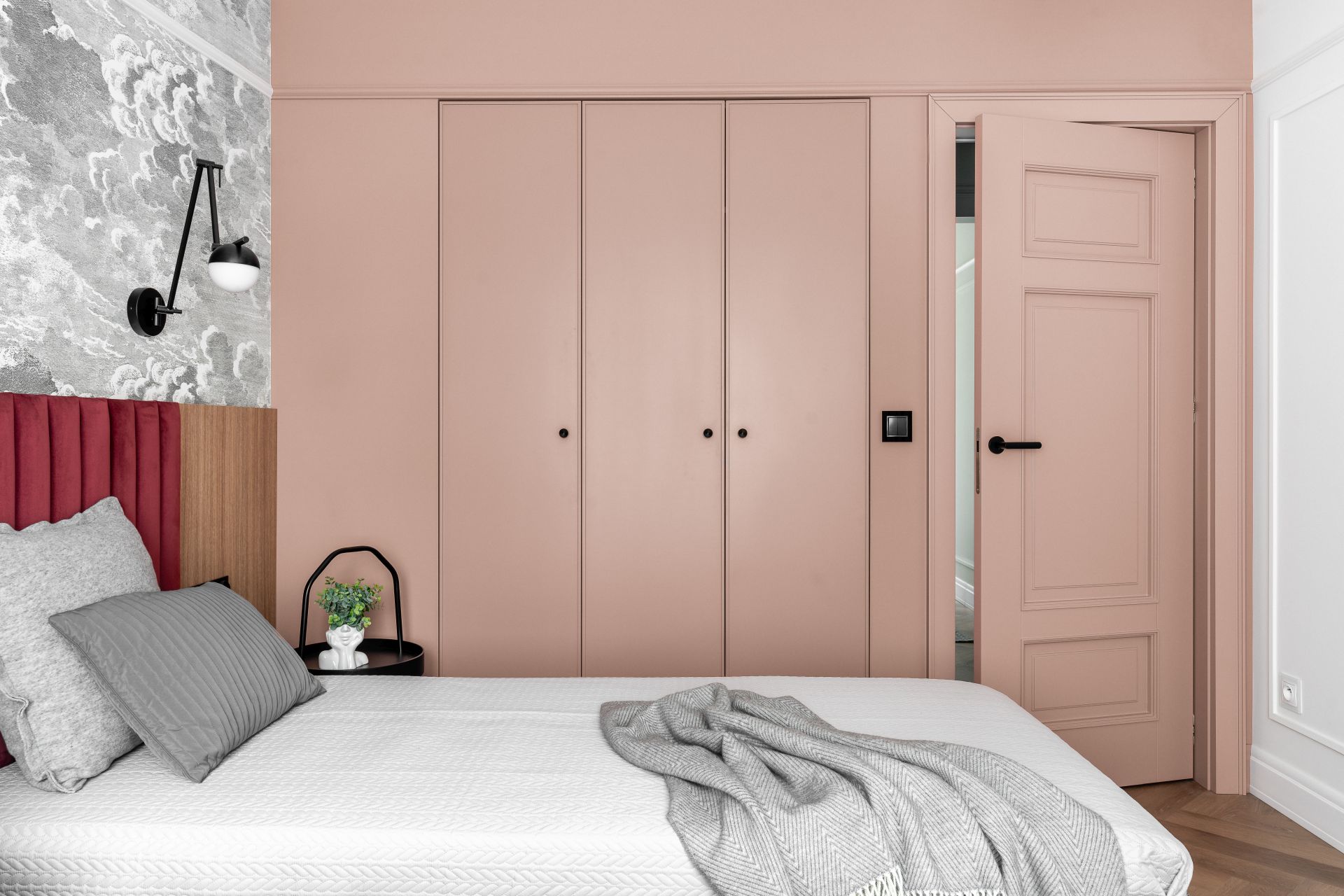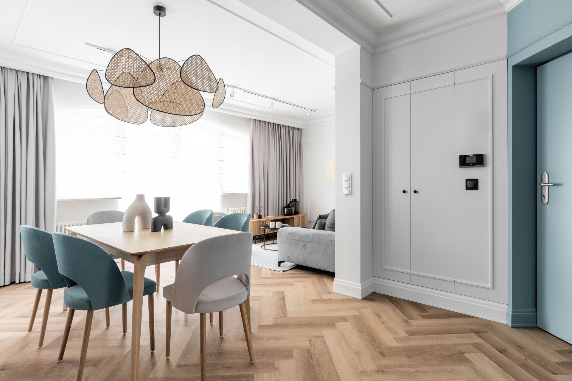 Mieszkanie to otwarta przestrzeń. Wejście prowadzi bezpośrednio do strefy dziennej z kuchnią i jadalnią, co optycznie powiększa wnętrze i sprzyja integracji użytkowników. Zabudowy meblowe sprytnie maskują nieregularne ściany, a wysokie szafki w kuchni poprawiają funkcjonalność i spójność stylistyczną pomieszczenia. Annie Marii Sokołowskiej zależało na tym, by przy otwartej kuchni całość była wizualnie spójna z pozostałą częścią mieszkania. Dlatego tak ważne było przejście motywu materiału z frontów kuchennych.