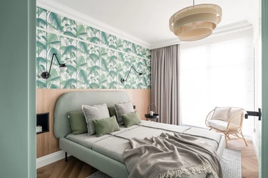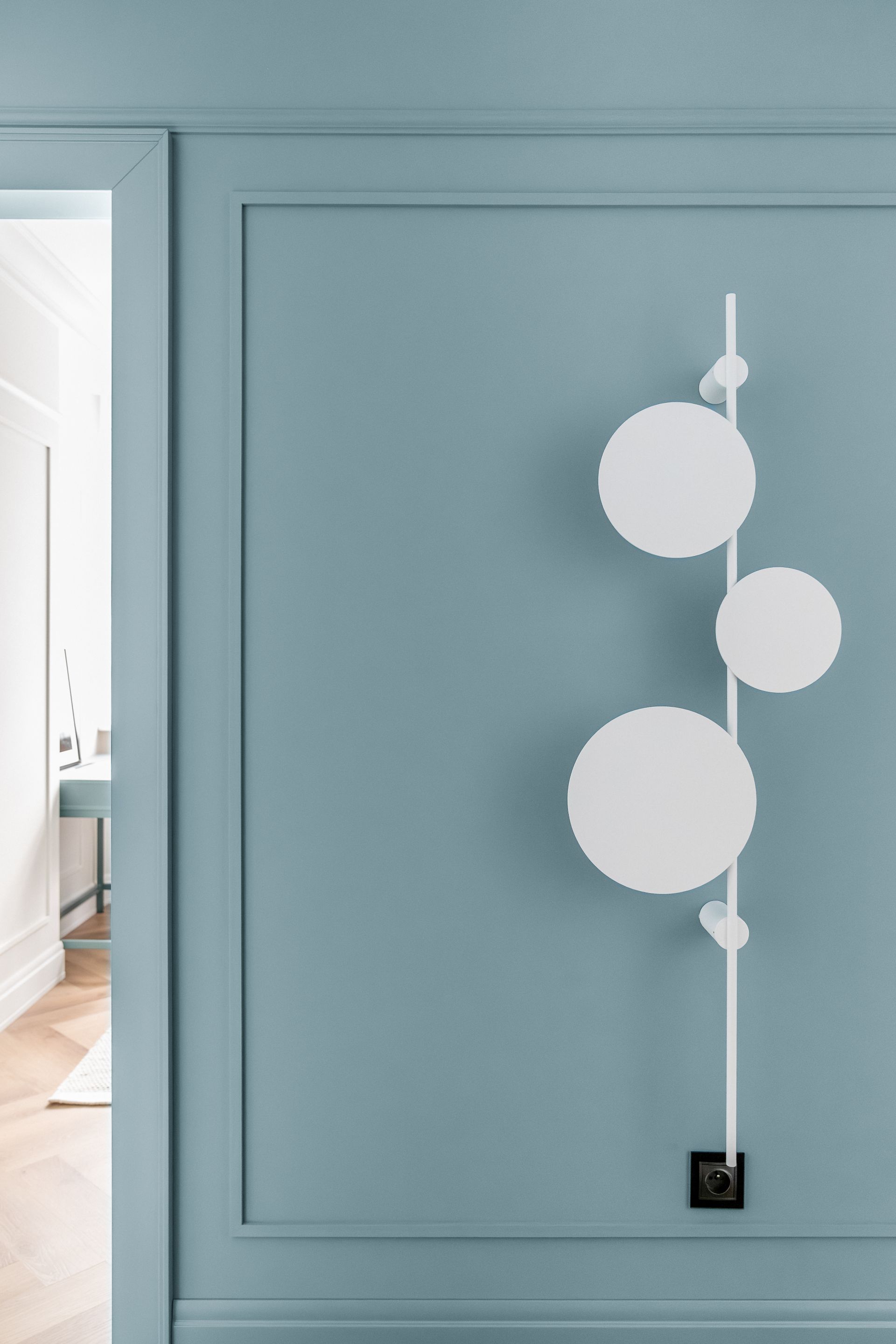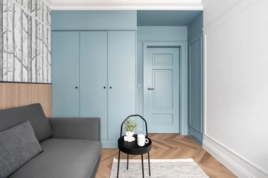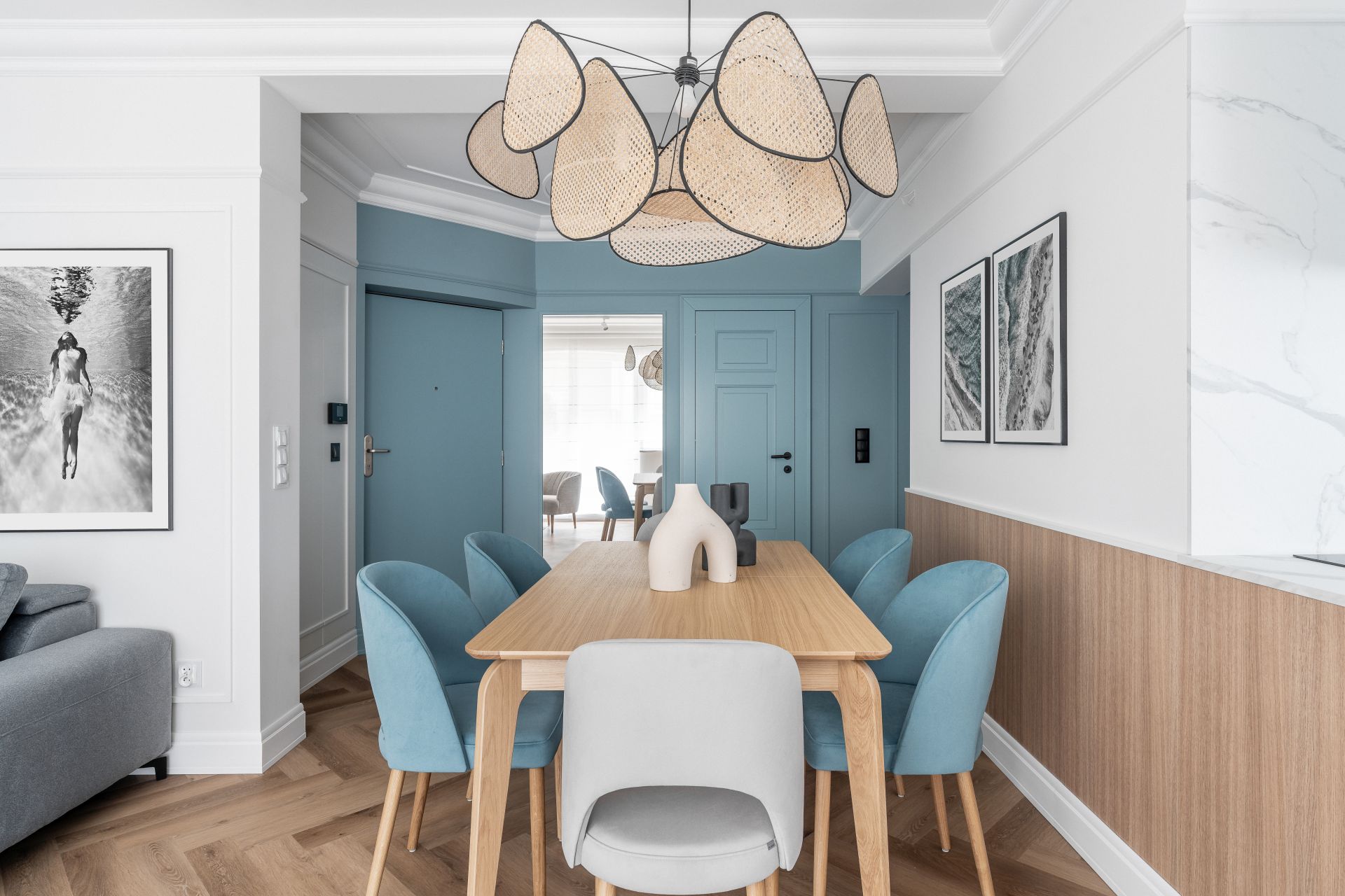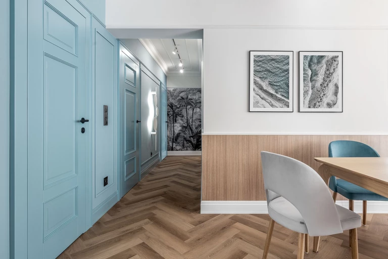 Główna ściana, biegnąca od wejścia do końca korytarza prowadzącego do sypialni i łazienki, została zatem utrzymana w kolorze niebieskim, który pojawił się także w kuchni, na krzesłach w jadalni oraz w jednym z pokojów. Dla kontrastu ściana po przeciwnej stronie pozostała biała, a jej dół wykończono drewnopodobną płytą meblową i białą listwą. Korytarz kończy tapeta z palmowym motywem, skracająca długi korytarz, tworząca wizualne zamknięcie przestrzeni.