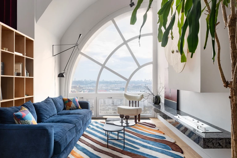 Nietypowy układ mieszkania i jego imponująca wysokość wymusiły rozwiązania niestandardowe. W połączeniu z pracami młodych artystów i dywanami zaprojektowanymi specjalnie pod to wnętrze architektka Yana Molodykh wykreowała przestrzeń tętniącą życiem i kolorem.