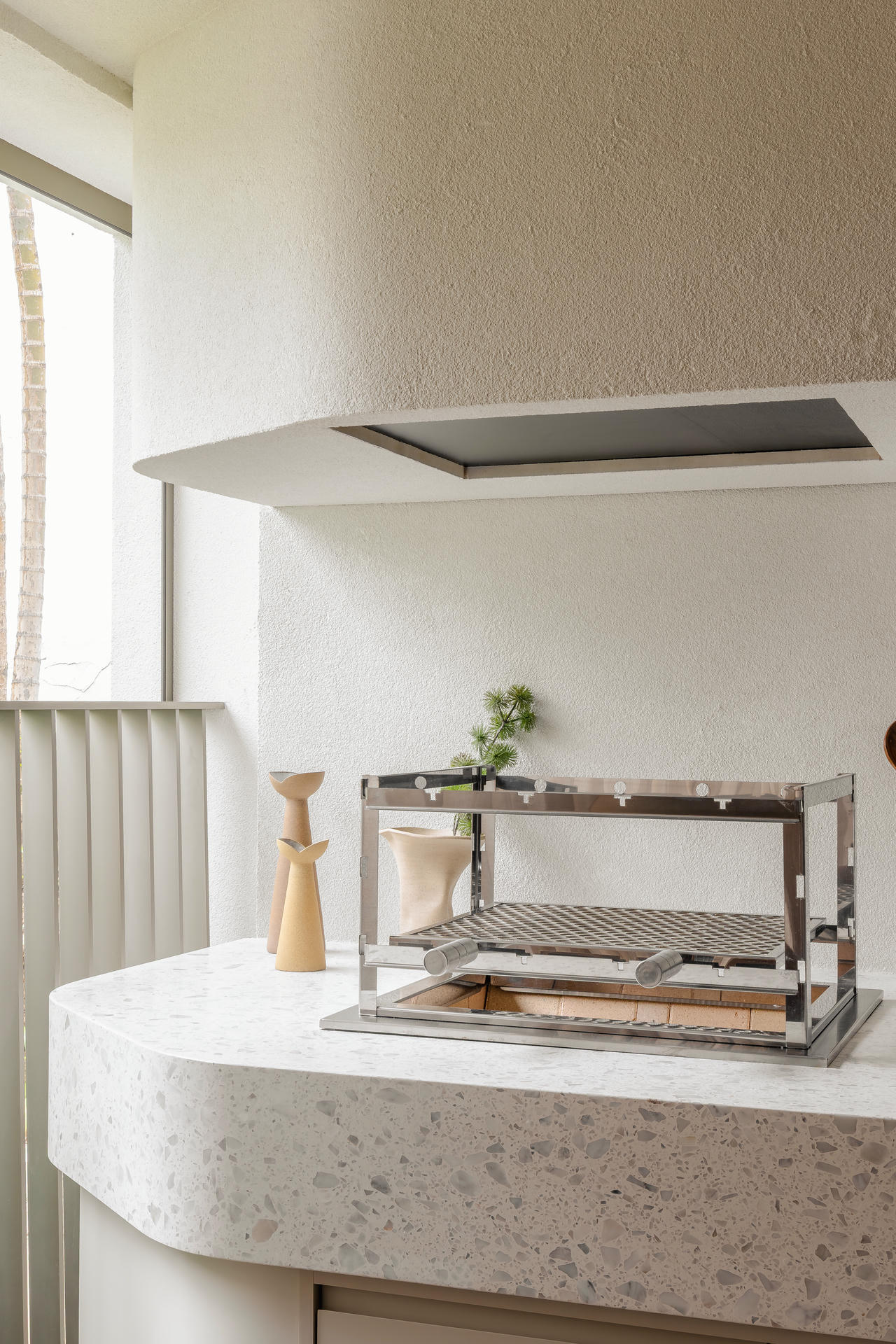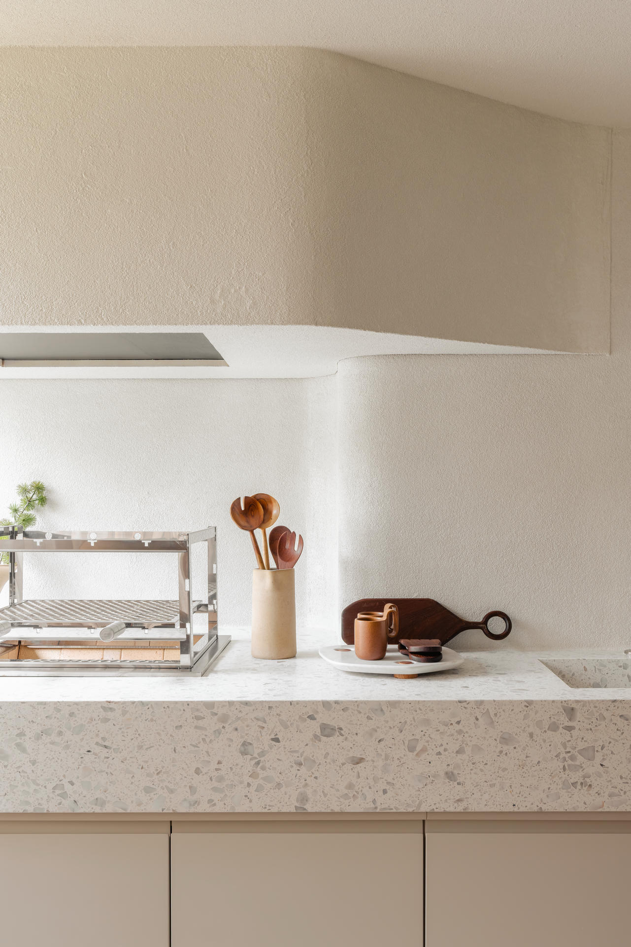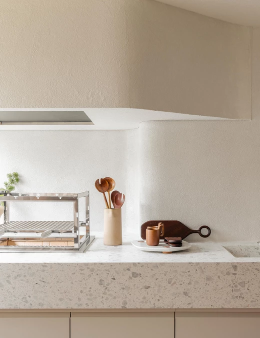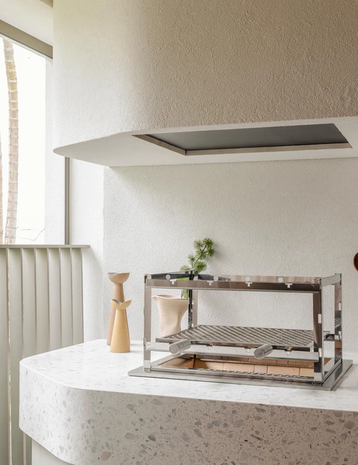 Dużą rolę odgrywają meble – wyselekcjonowane projekty rodzimych designerów mają wyraźną, rzeźbiarską formę, ale jednocześnie nie dominują wnętrza. Ryflowane fronty, wnęki i półki pomagają zorganizować przestrzeń, jednocześnie jej nie obciążając wizualnie.