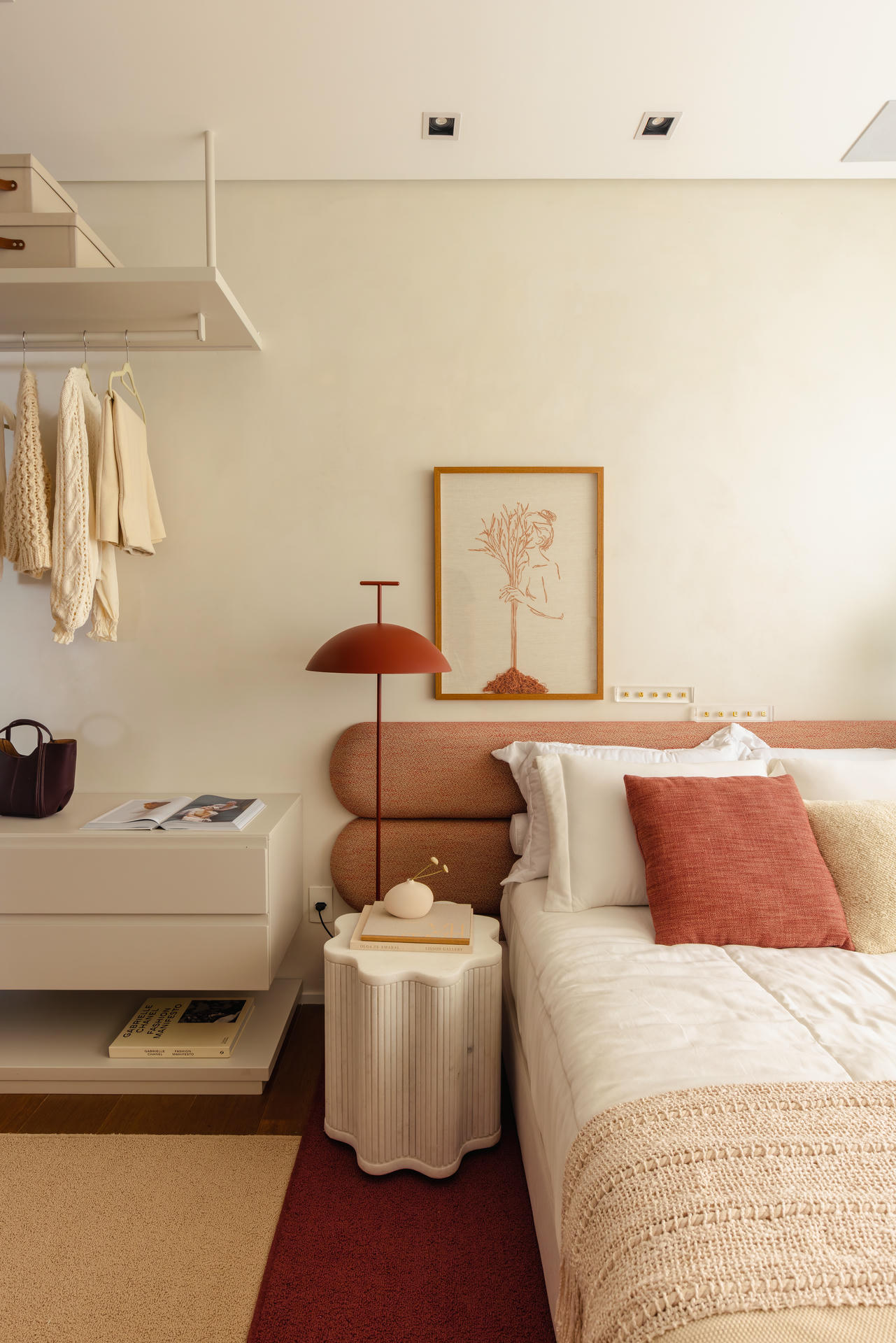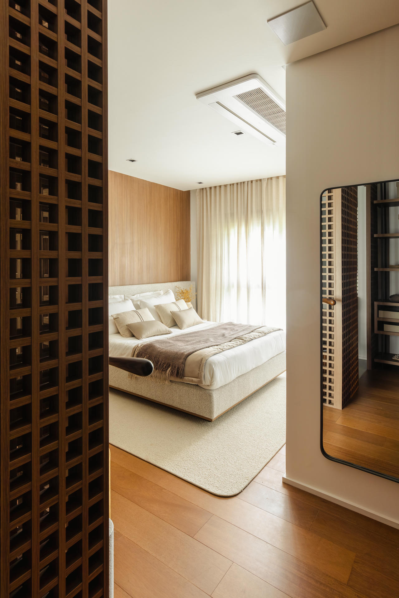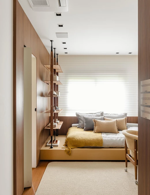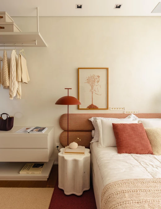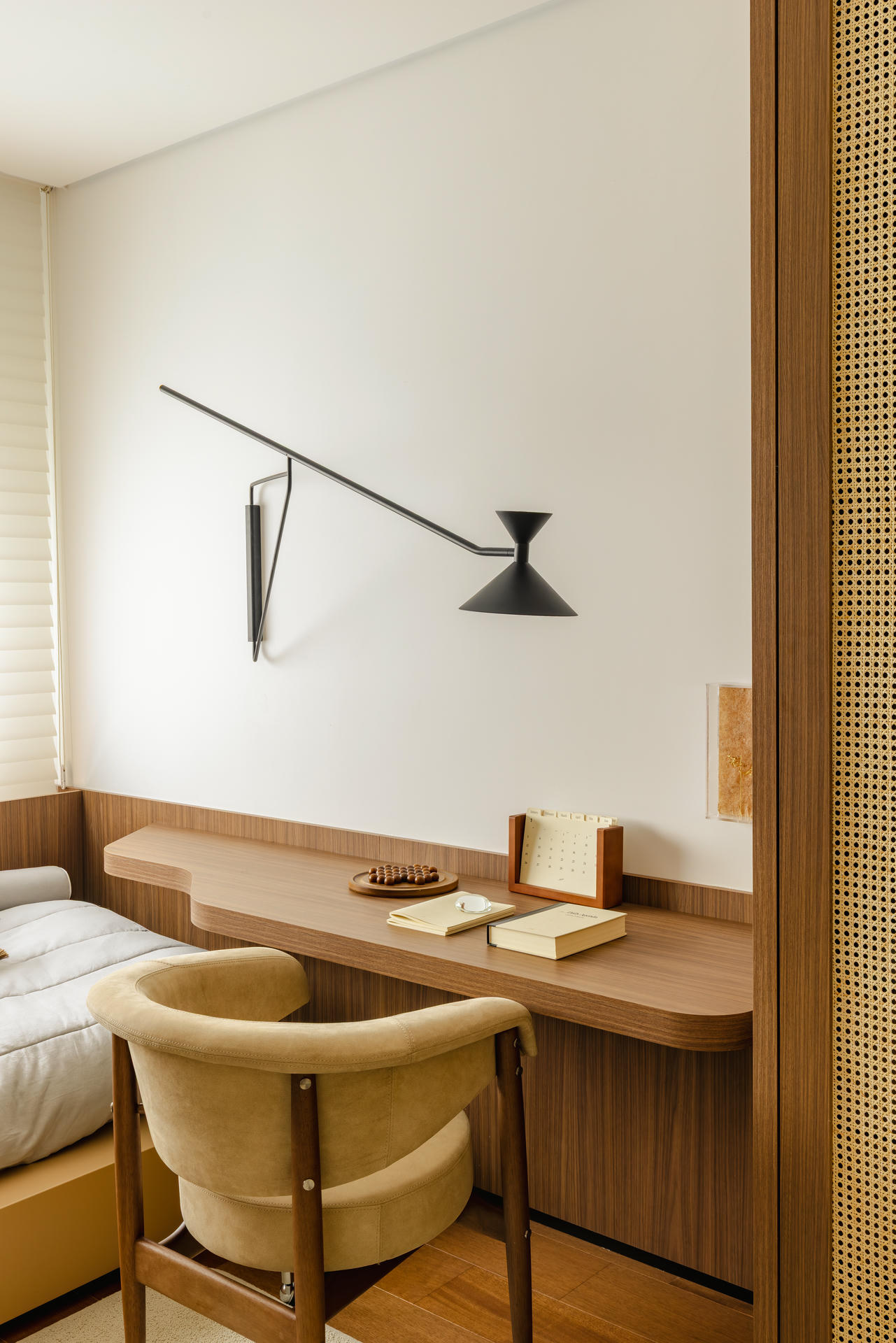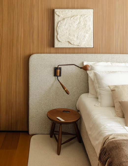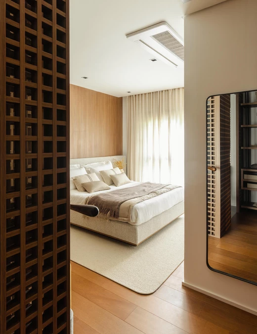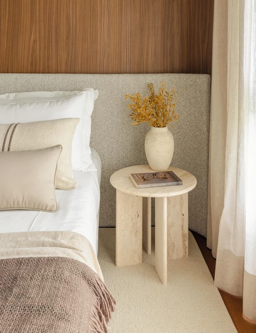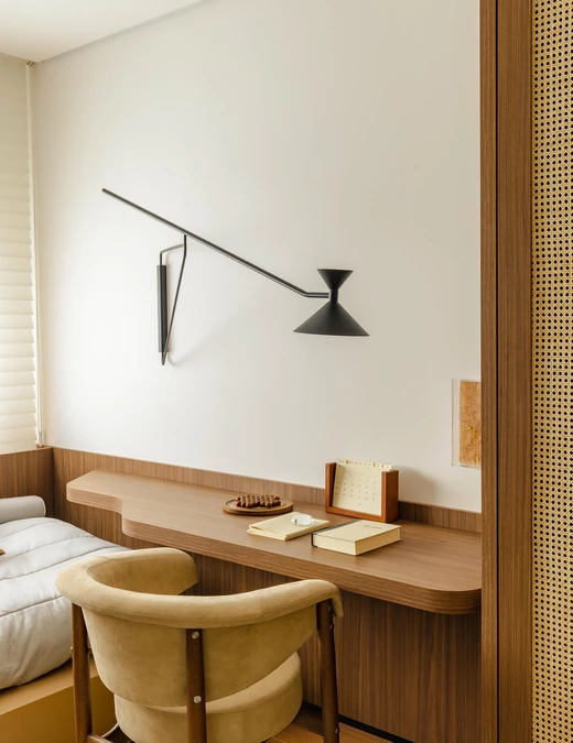 W części prywatnej ten sam język projektowy zostaje zachowany, a jednocześnie subtelnie wyciszony. Sypialnia jest spokojna, oparta na drewnie, miękkich tkaninach i delikatnym świetle. Pozostałe pomieszczenia, pokój dziecka i domowe biuro, wpisują się w tę samą logikę i łączą funkcjonalność z wizualną lekkością.