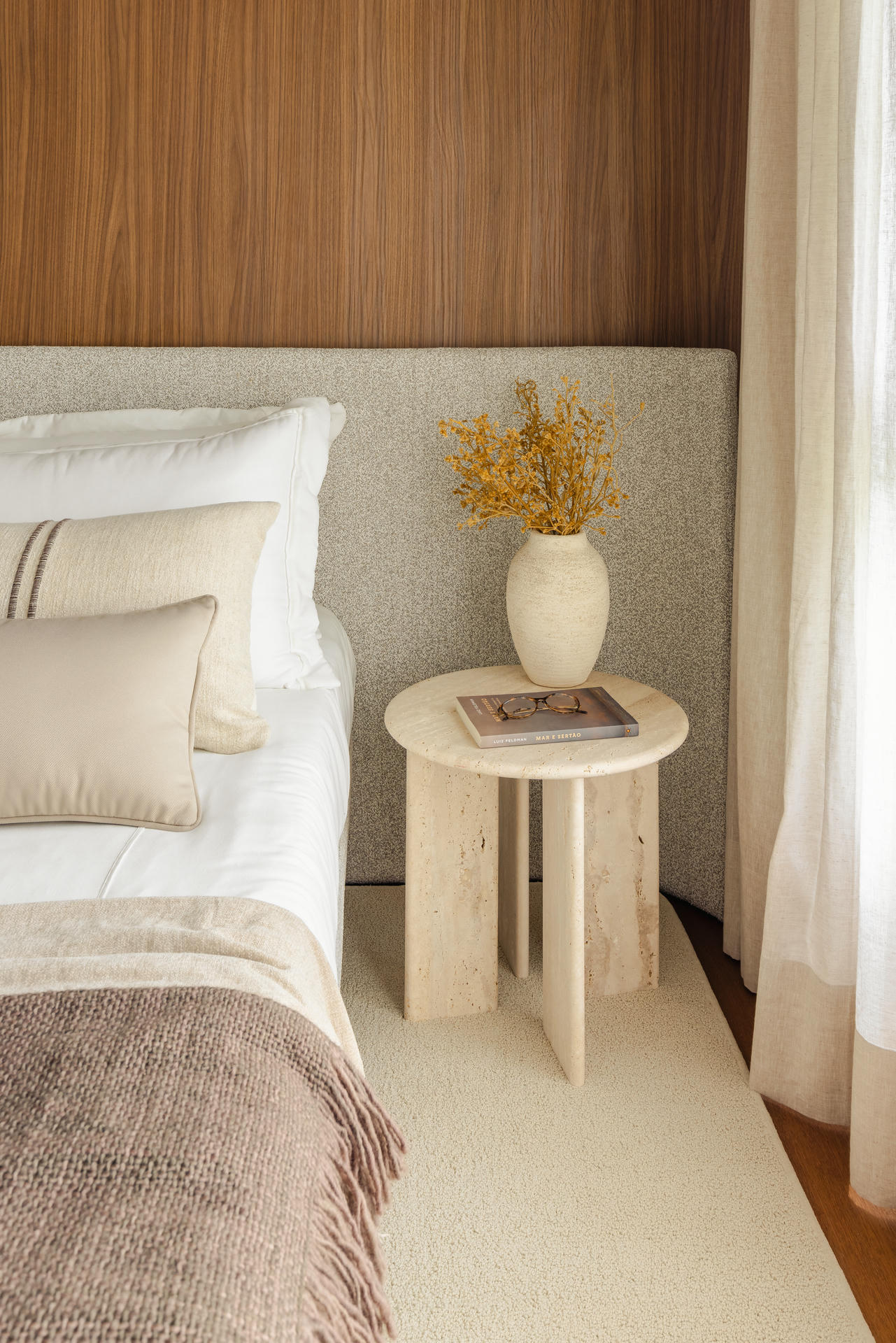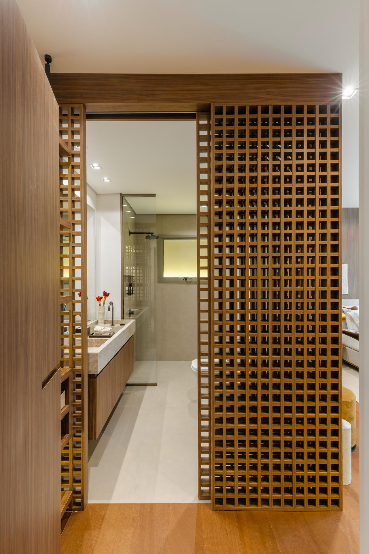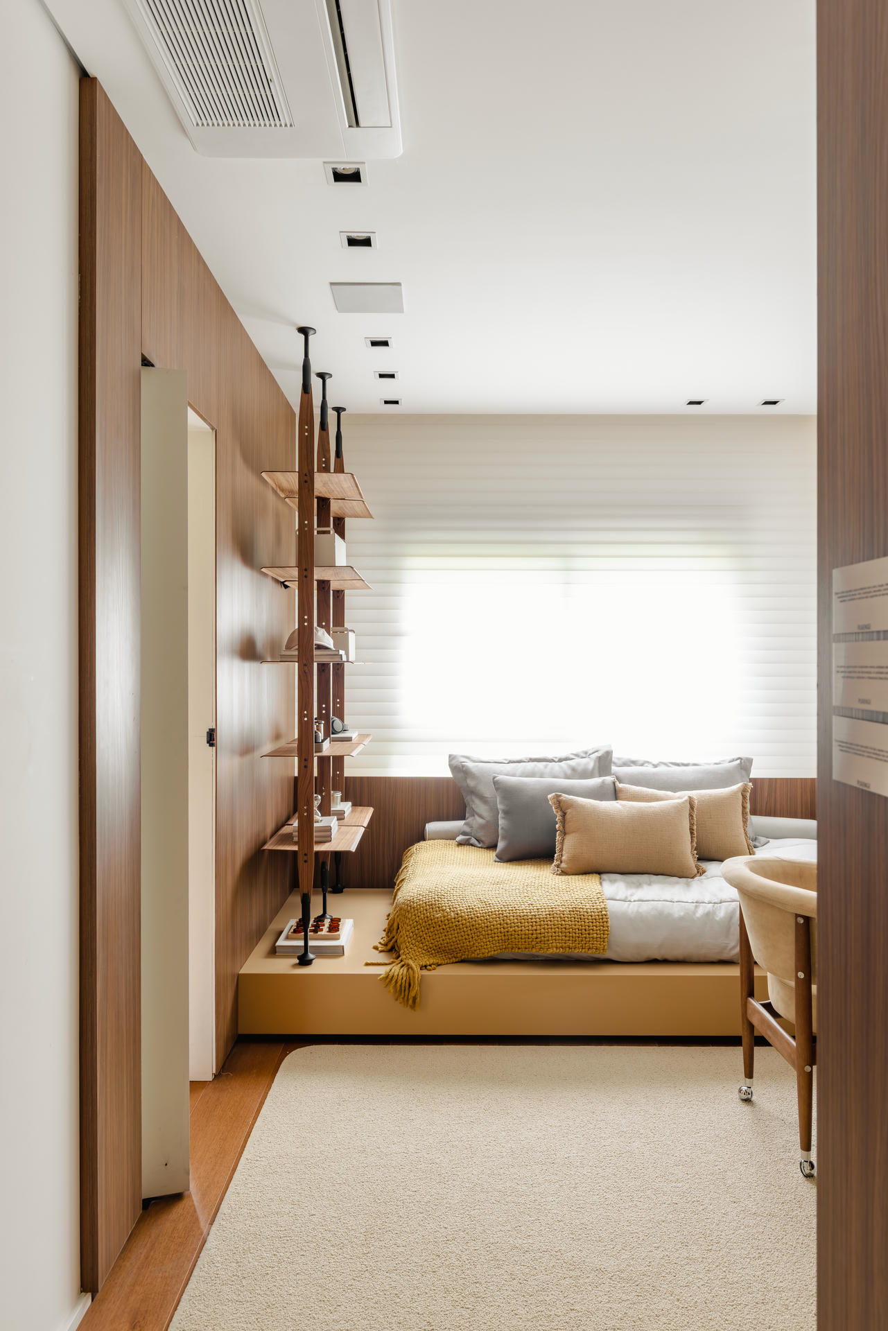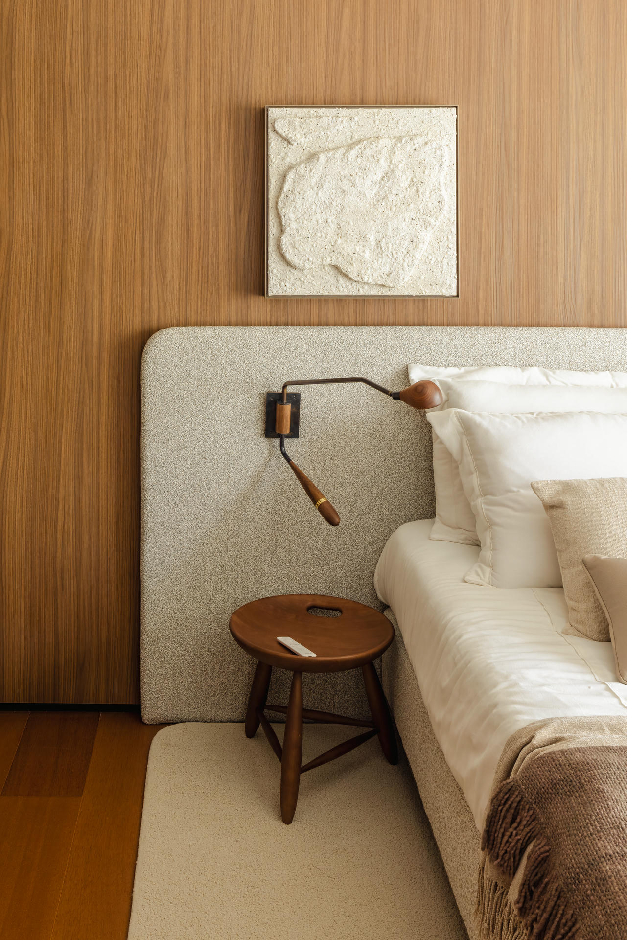 W części prywatnej ten sam język projektowy zostaje zachowany, a jednocześnie subtelnie wyciszony. Sypialnia jest spokojna, oparta na drewnie, miękkich tkaninach i delikatnym świetle. Pozostałe pomieszczenia, pokój dziecka i domowe biuro, wpisują się w tę samą logikę i łączą funkcjonalność z wizualną lekkością.