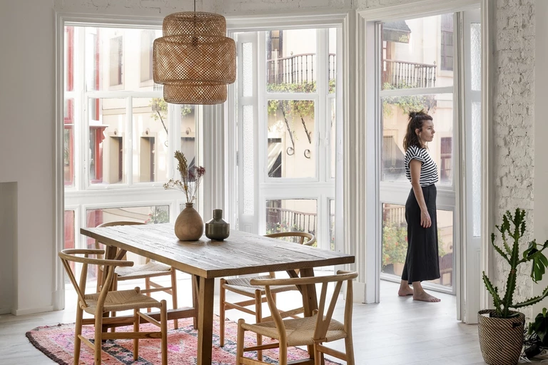 Nie brakuje tu szklanych i ceramicznych naczyń o intrygujących kształtach, tkanych dywanów i drewna. Kuchnię zakupiono w IKEA, podobnie jak charakterystyczną lampę wiszącą nad stołem jadalnianym. Stół i dywan właściciele przywieźli ze swoich podróży, zaś krzesła zostały im podarowane przez członków rodziny. Oprócz tego autentycznego charakteru dodają wnętrzu obrazy autorstwa malarza Gabriela Coca.