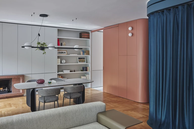 Sercem mieszkania jest salon, w którym wzrok przyciągają kominek z różowego granitu oraz dwie bryły o miękkich kształtach. W niebieskiej bryle mieści się korytarz z szafami i kącik do pracy, który w każdej chwili można oddzielić od strefy dziennej kotarą. Z kolei w głębi różowej znajduje się kuchnia, do której dostać się można przez dwie pary drzwi przesuwnych. Istotnym elementem wnętrza jest także zajmująca całą ścianę zabudowa meblowa z szafkami i półkami.