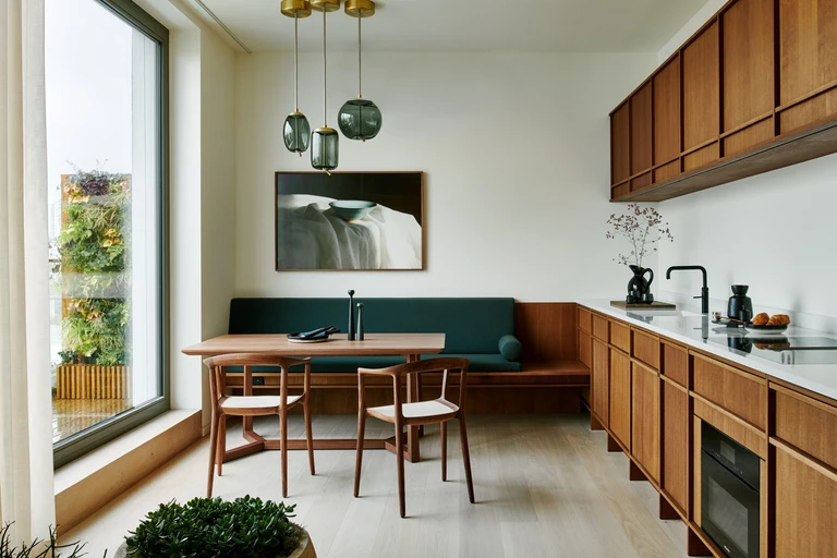 Kącik jadalniany należy do jednych z ulubionych miejsc właścicielki mieszkania. Stół i krzesła japońskiej marki Miyazaki tworzą centrumtej części apartamentu. Meble zachwycają nie tylko doskonałym rzemiosłem, ale i prostotą formy.