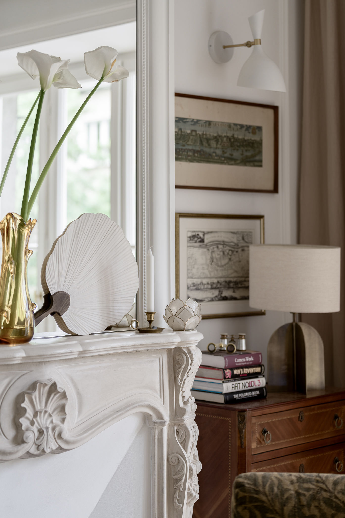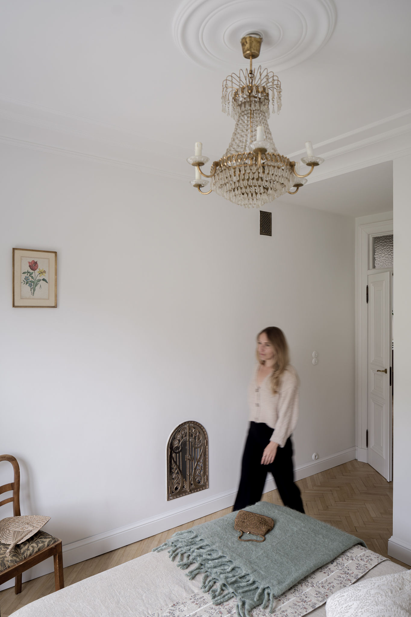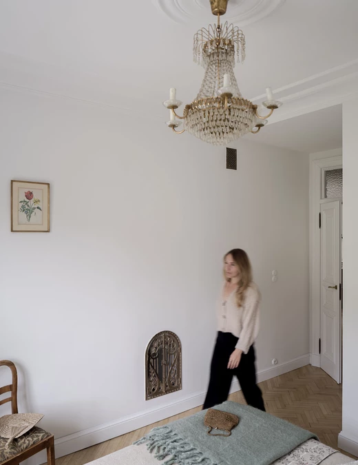 Każde pomieszczenie kryje w sobie ślady przeszłości potraktowane z ogromną uważnością. W sypialni, dawniej pełniącej funkcję pokoju herbacianego, przetrwał oryginalny kominek z mosiężnymi drzwiczkami, zlicowany ze ścianą. W łazience natomiast udało się dokonać rzeczy rzadkiej - niemal identycznie odtworzono przedwojenny układ i format białych płytek, zachowując specyficzny detal wykończeniowy. Choć pierwotny salon kąpielowy został nieco zmniejszony, projektantom udało się wygospodarować miejsce na wolno stojącą wannę, dbając o to, by funkcjonalność nie odebrała wnętrzu luksusowego, kamienicznego charakteru.