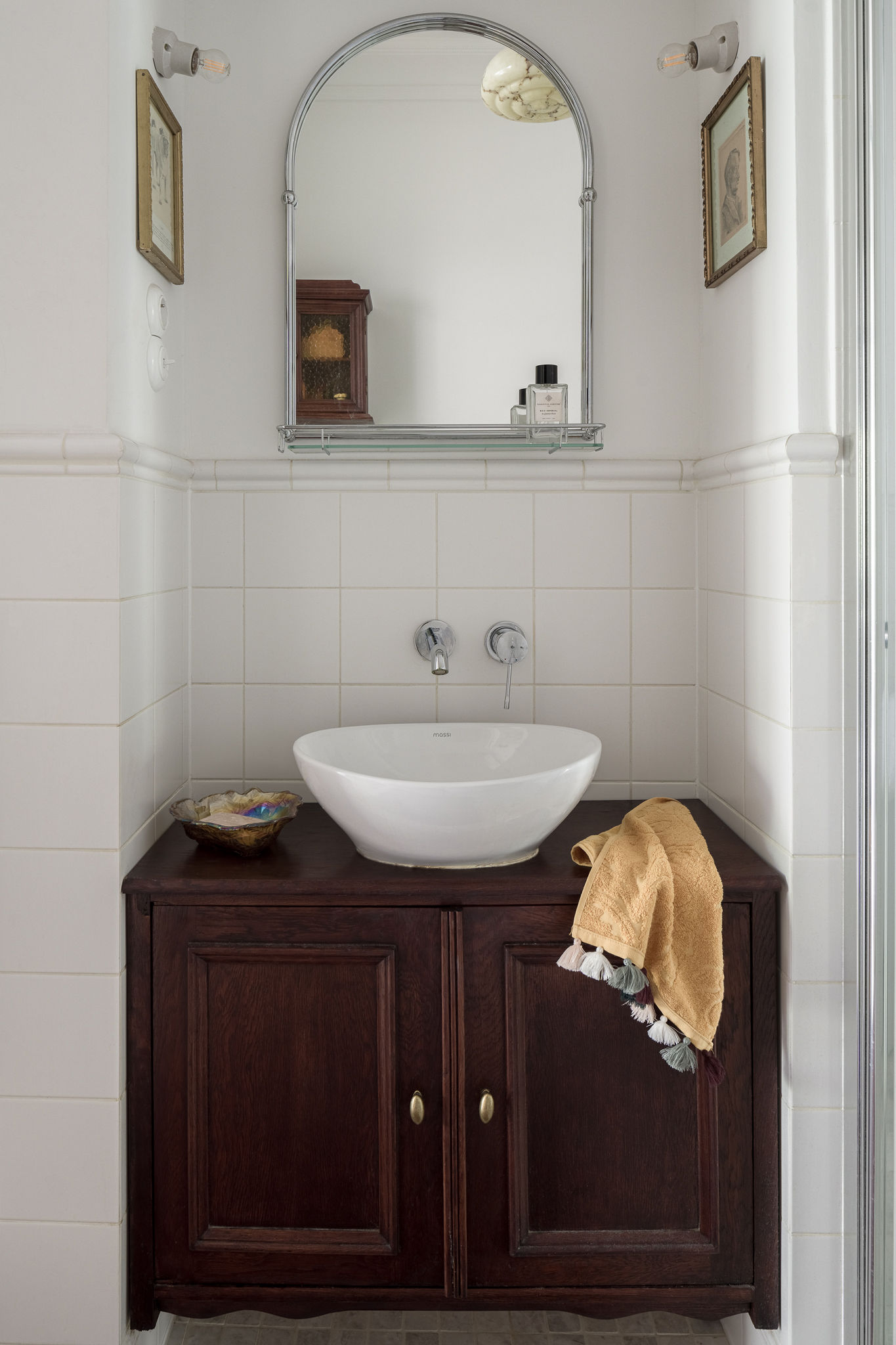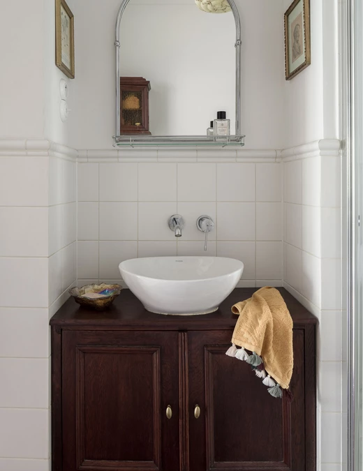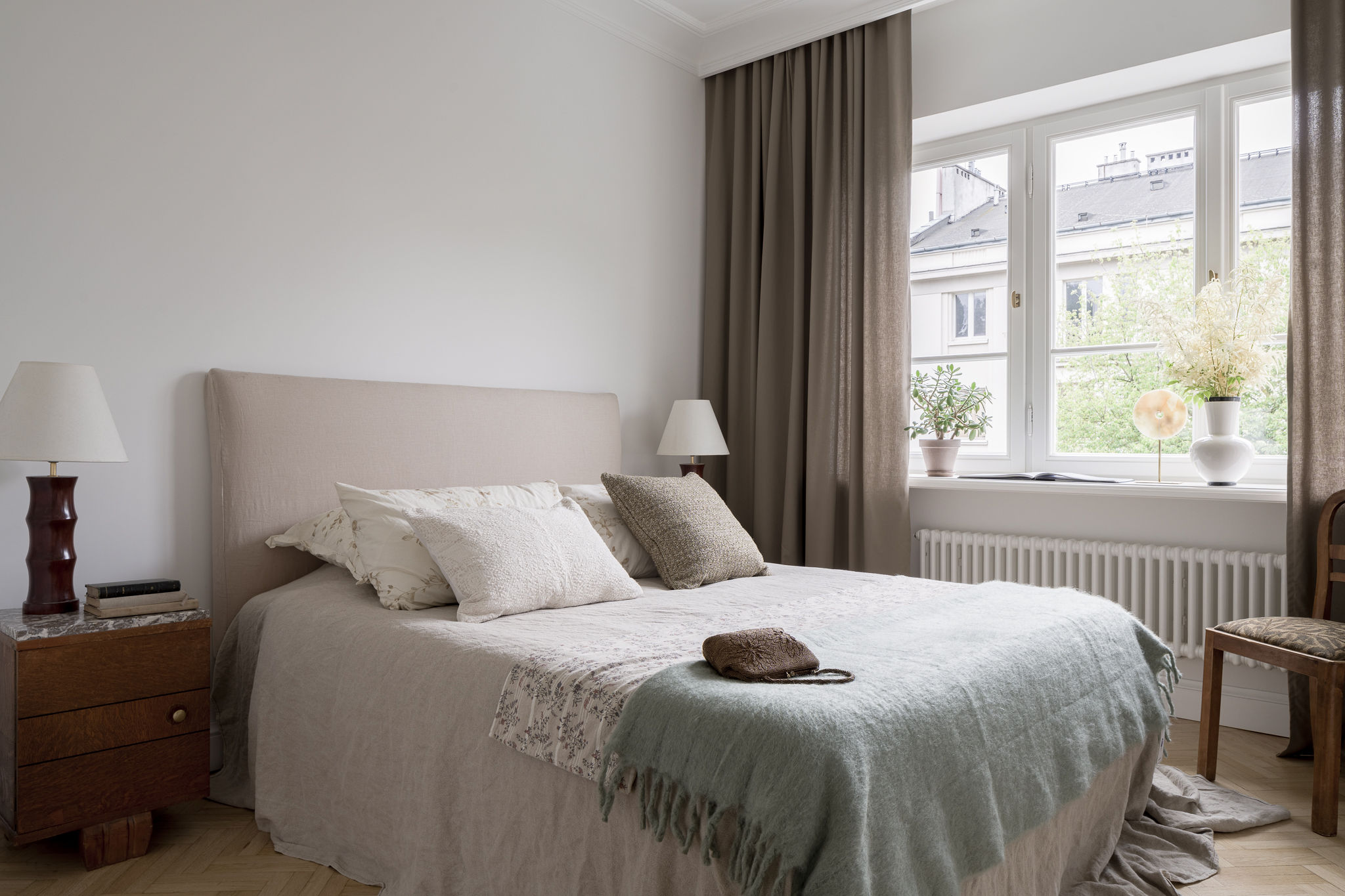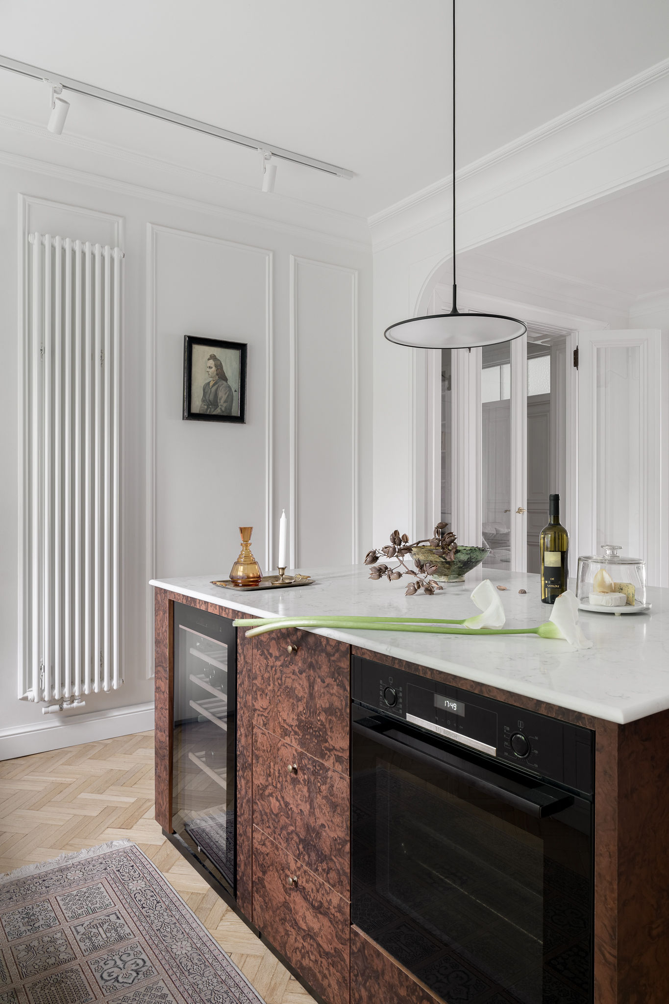 Każde pomieszczenie kryje w sobie ślady przeszłości potraktowane z ogromną uważnością. W sypialni, dawniej pełniącej funkcję pokoju herbacianego, przetrwał oryginalny kominek z mosiężnymi drzwiczkami, zlicowany ze ścianą. W łazience natomiast udało się dokonać rzeczy rzadkiej - niemal identycznie odtworzono przedwojenny układ i format białych płytek, zachowując specyficzny detal wykończeniowy. Choć pierwotny salon kąpielowy został nieco zmniejszony, projektantom udało się wygospodarować miejsce na wolno stojącą wannę, dbając o to, by funkcjonalność nie odebrała wnętrzu luksusowego, kamienicznego charakteru.