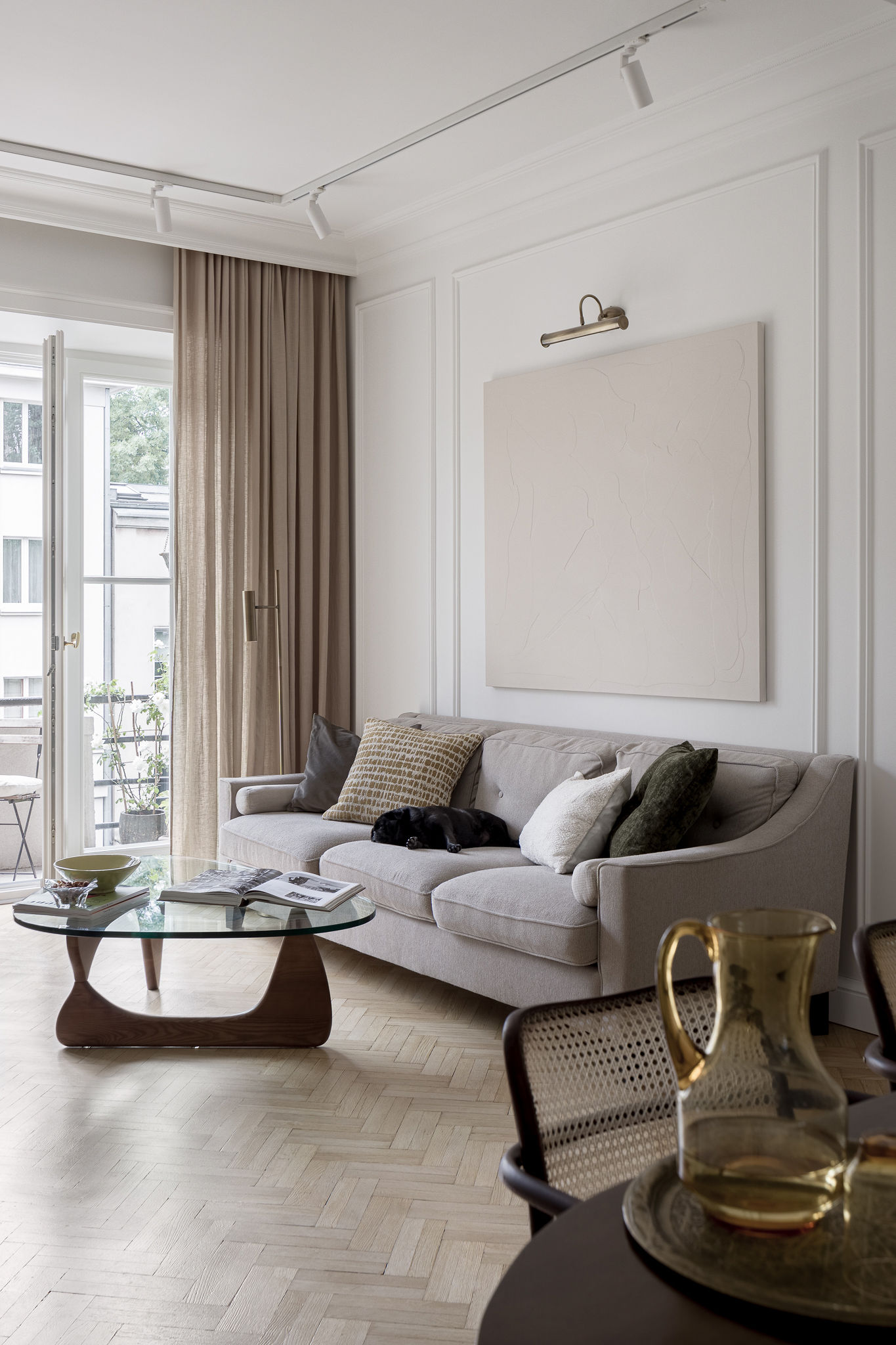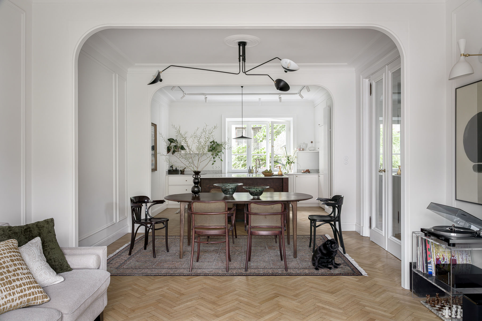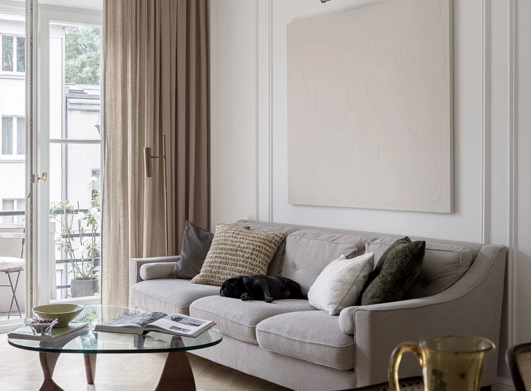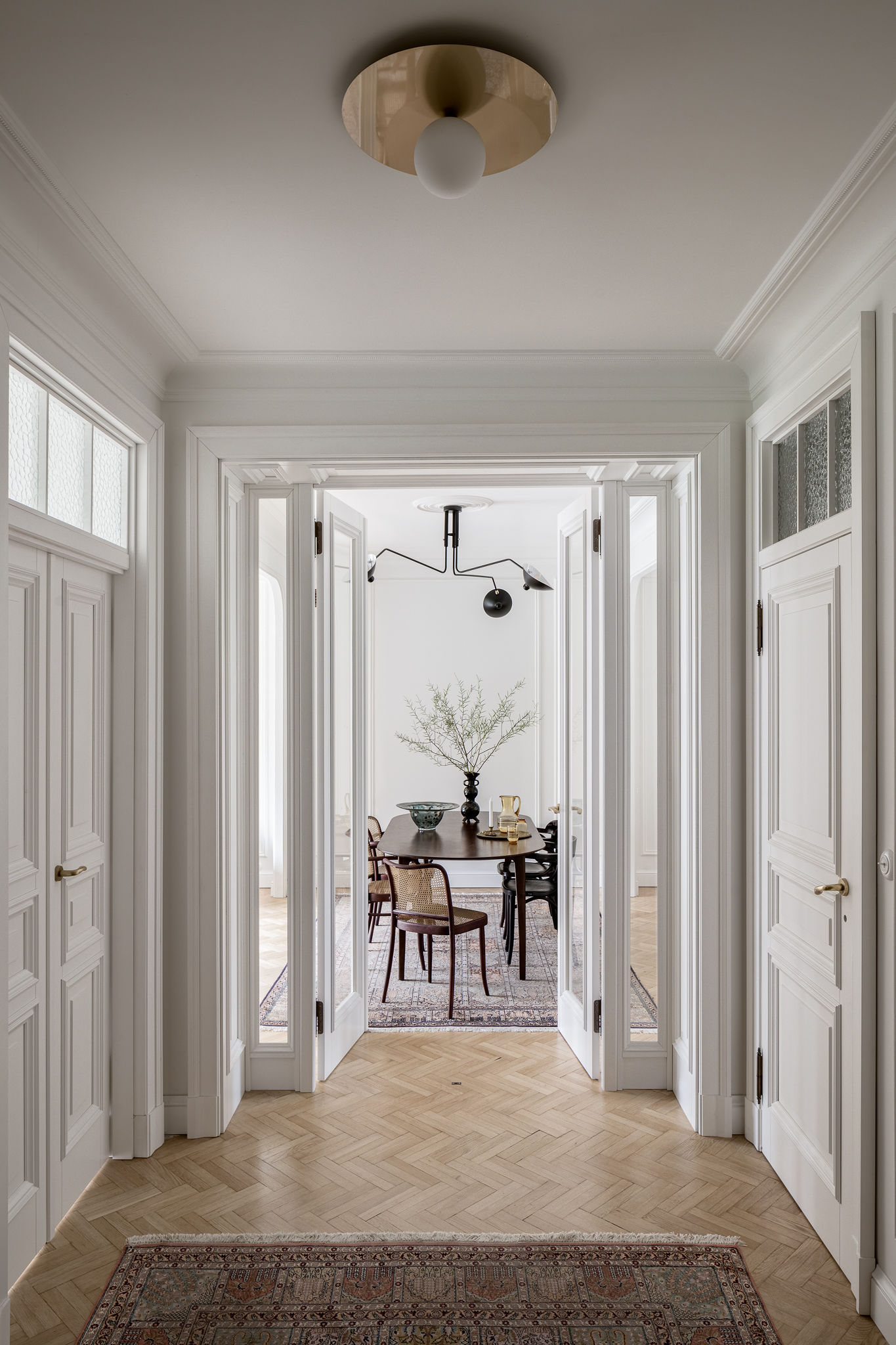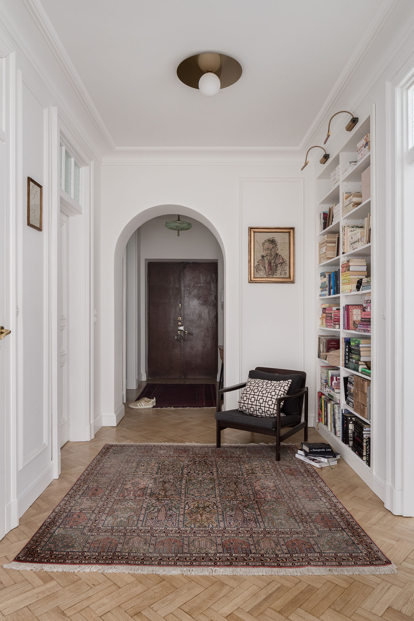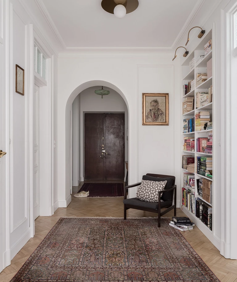 Wnętrze unika dosłowności i muzealnego chłodu, znajdując punkt styku między surowością polskiego modernizmu a miękkością paryskiego szyku. To przestrzeń, która oddycha - jasna, wypełniona światłem wpadającym przez wysokie okna, a jednocześnie kojąca i przytulna. Hol wejściowy z autentycznymi półkolistymi łukami, tak charakterystycznymi dla projektów Jawornickiego, wprowadza w klimat mieszkania już od progu. Atmosferę budują tu przedwojenny dywan i fotel z lat 30., stanowiące zapowiedź eklektycznej narracji, która toczy się w kolejnych pokojach.