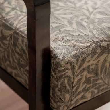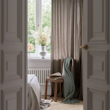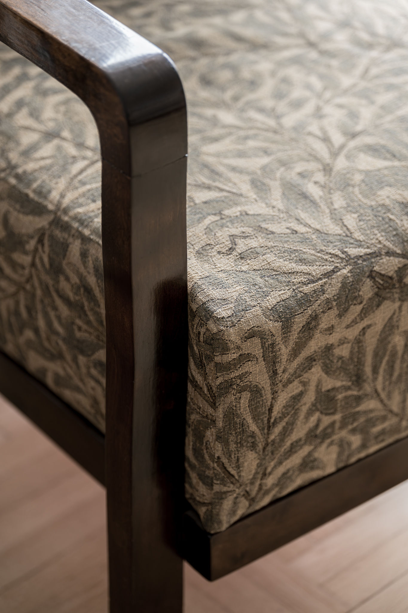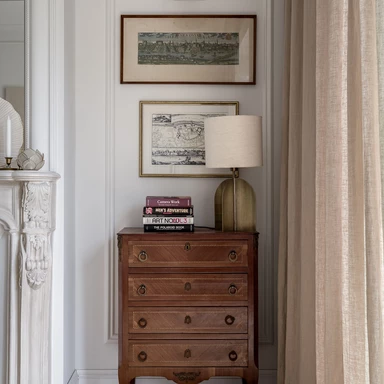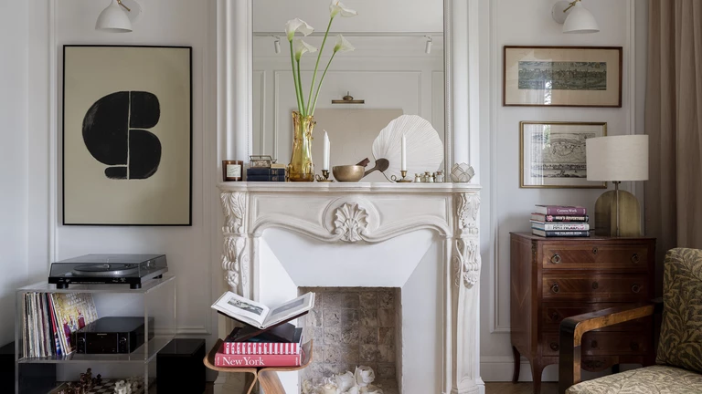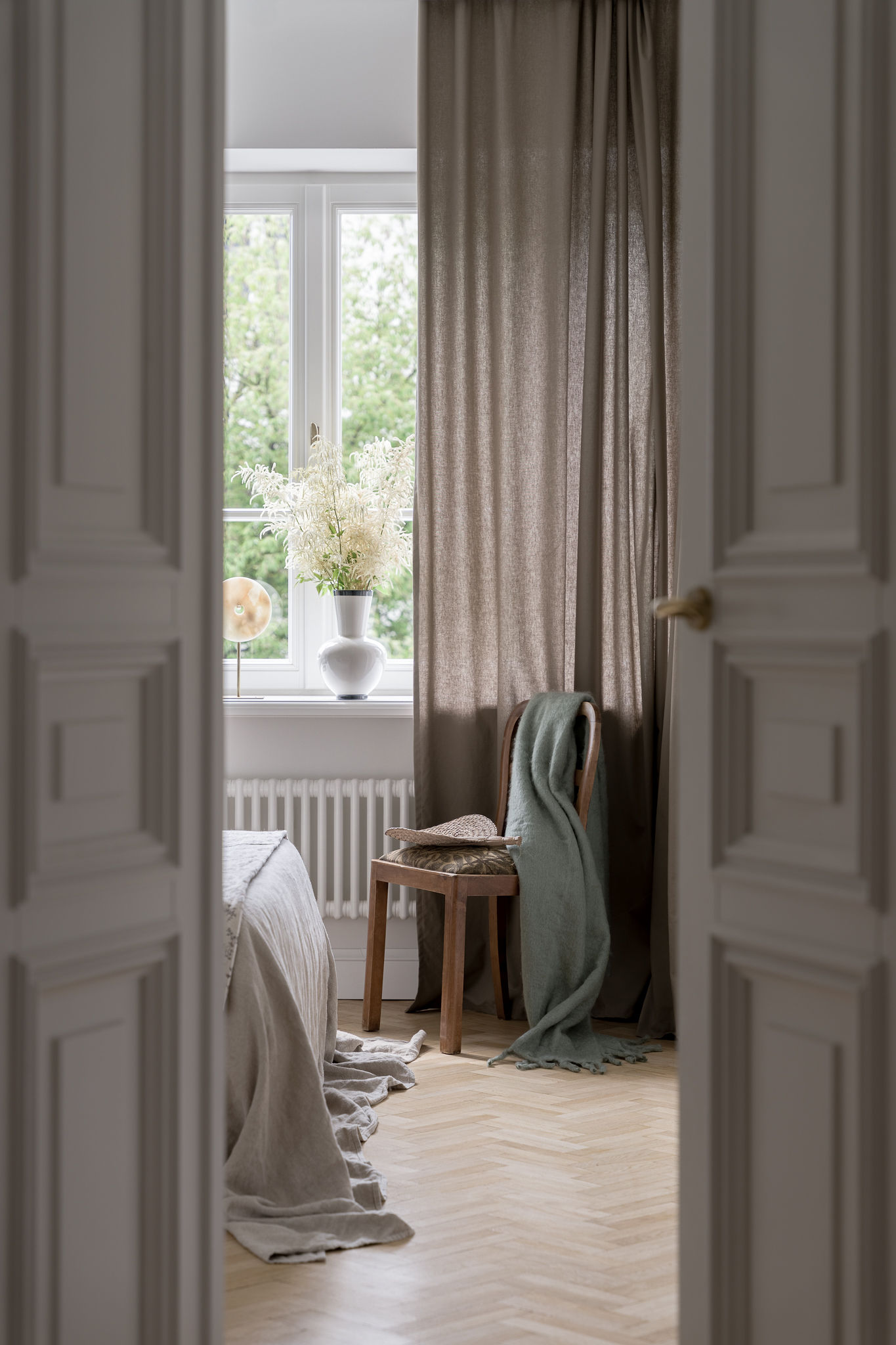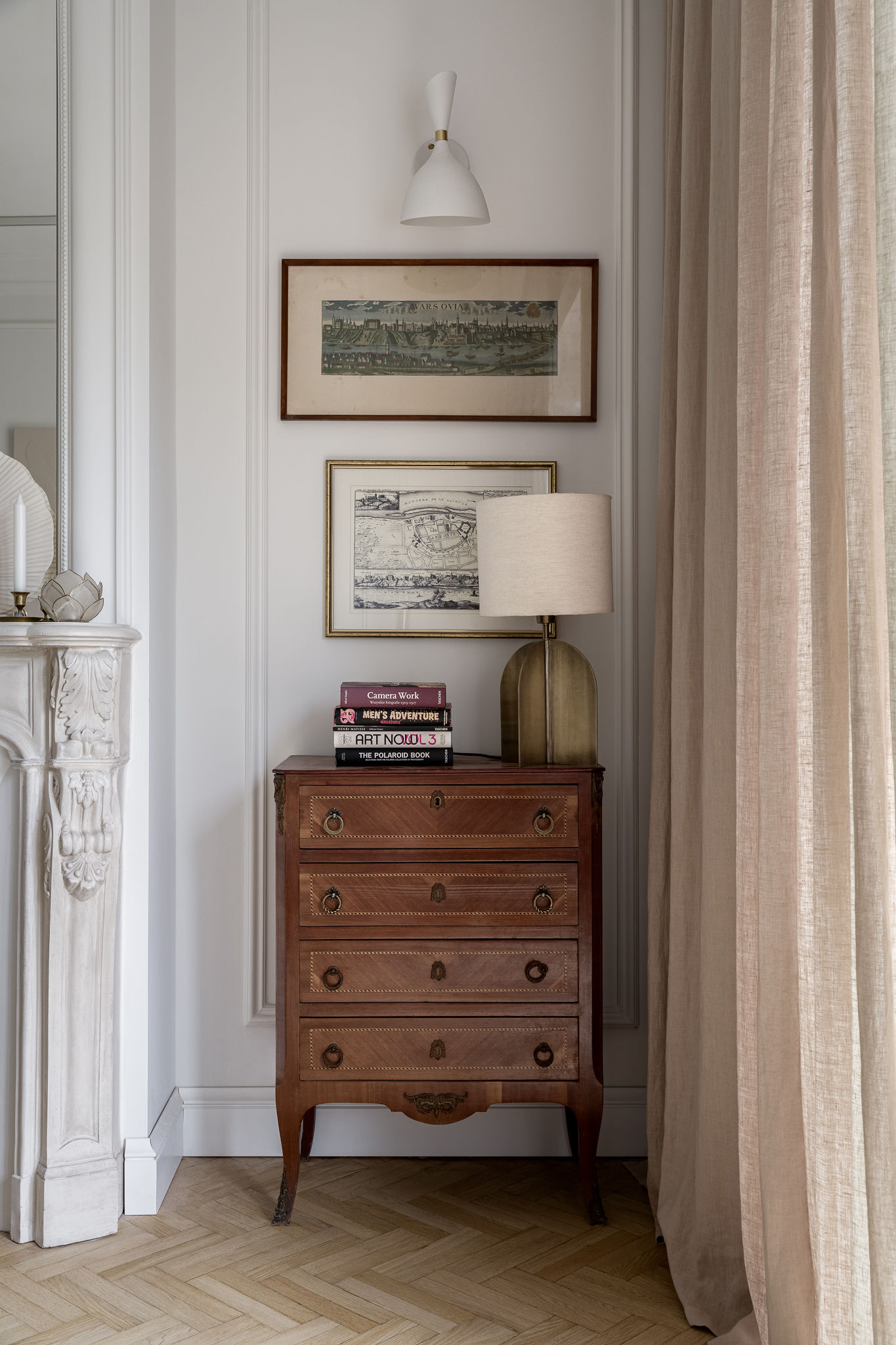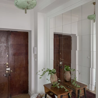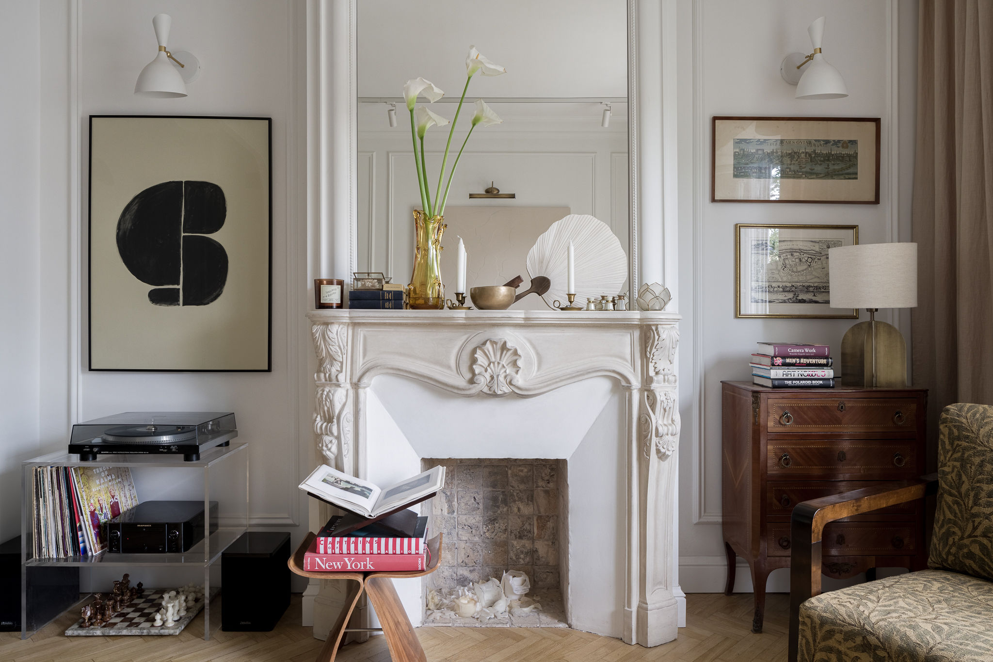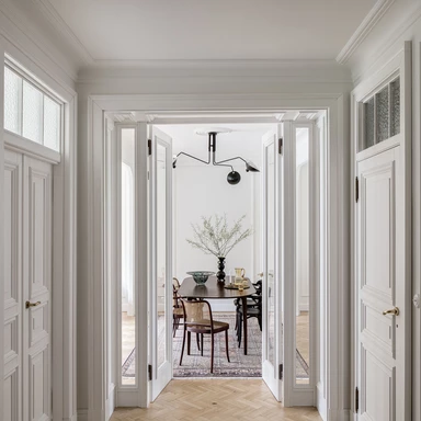 Wnętrze unika dosłowności i muzealnego chłodu, znajdując punkt styku między surowością polskiego modernizmu a miękkością paryskiego szyku. To przestrzeń, która oddycha - jasna, wypełniona światłem wpadającym przez wysokie okna, a jednocześnie kojąca i przytulna. Hol wejściowy z autentycznymi półkolistymi łukami, tak charakterystycznymi dla projektów Jawornickiego, wprowadza w klimat mieszkania już od progu. Atmosferę budują tu przedwojenny dywan i fotel z lat 30., stanowiące zapowiedź eklektycznej narracji, która toczy się w kolejnych pokojach.