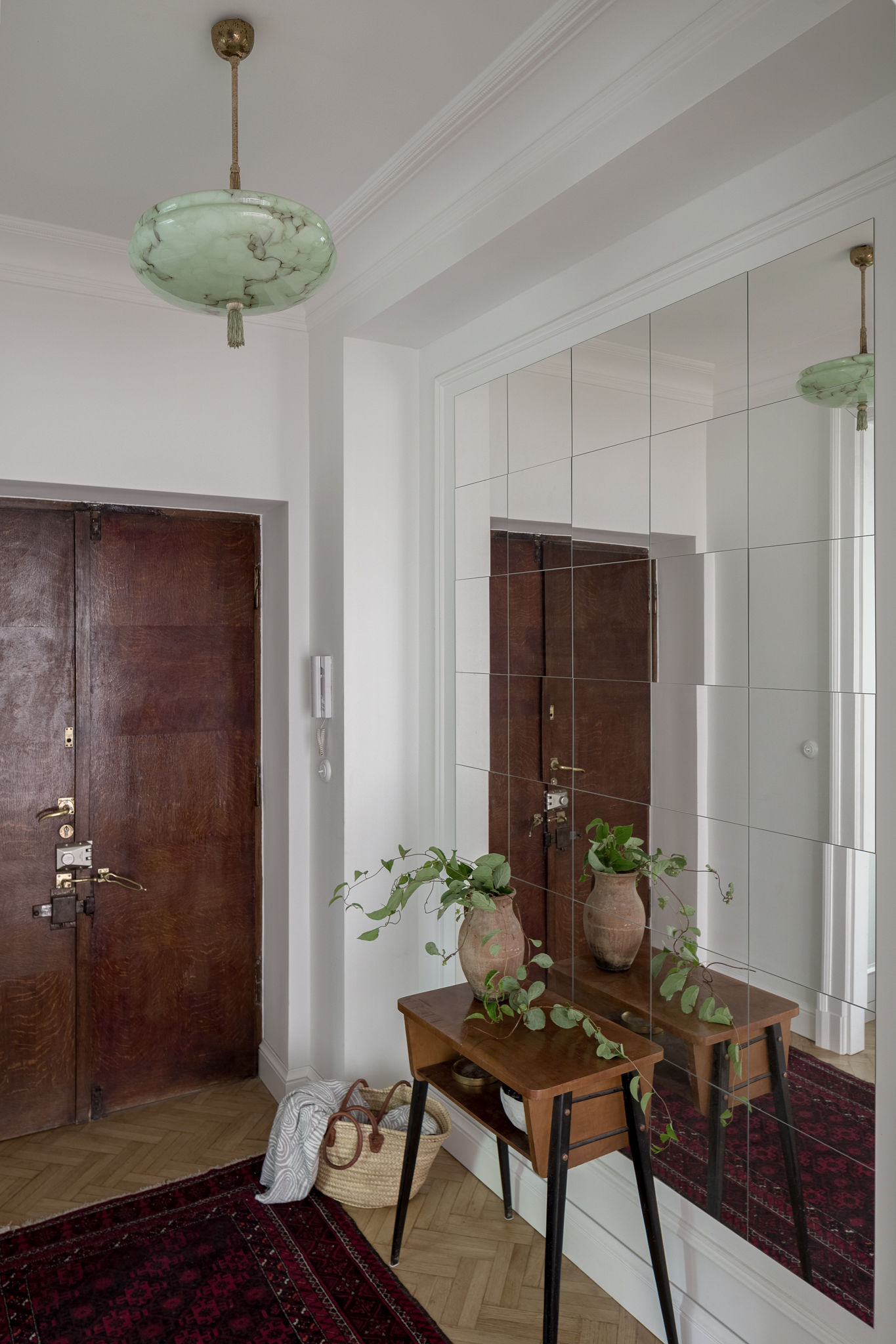 Wyposażenie mieszkania to konsekwentnie budowana kolekcja przedmiotów „z odzysku” i pamiątek. Większość dywanów pamięta czasy przedwojenne, a część dekoracji odnaleziono bezpośrednio w piwnicach kamienicy, dając im drugie życie w odnowionych wnętrzach. To mieszkanie nie próbuje niczego udawać. Jest autentyczne, mocno osadzone w kontekście miejsca i biografii jego twórców. Modernistyczny porządek spotyka się tu z subtelną dekoracyjnością i artystyczną wrażliwością, tworząc przestrzeń o wyraźnej tożsamości, która - podobnie jak architektura Antoniego Jawornickiego - zdaje się opierać upływowi czasu.