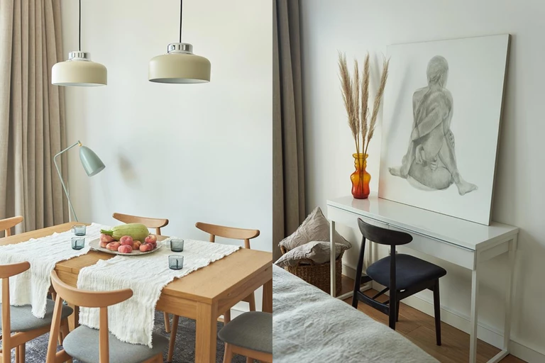 Salon i jadalnia są sercem mieszkania, jest to otwarta przestrzeń połączona korytarzem z dwoma sypialniami i łazienką. Dominują w niej meble, które są mobilne i łatwy sposób można zmienić ich ustawienie według zastosowania domowników.