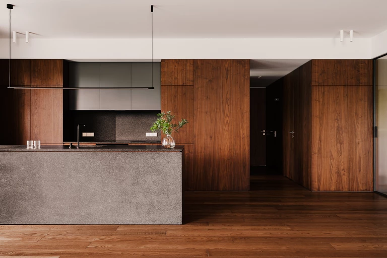 Wysokie szafy kuchenne łączą się z zabudową w korytarzu, która prowadzi do strefy nocnej. Fronty szaf, drzwi oraz panele ścienne wykończono naturalnym fornirem orzechowym. Drewno orzechowe przenika również do wnętrza łazienki, harmonijnie łącząc się z płytkami w kolorze ciemnej zieleni.
