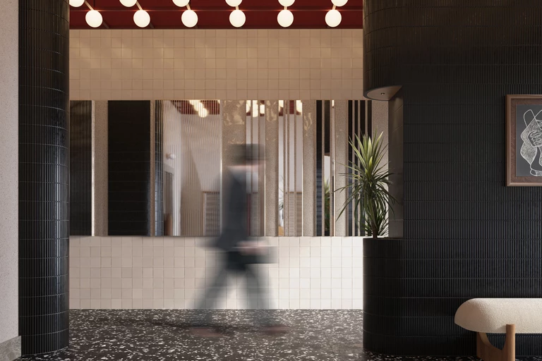 Ciepłe drewno, lastryko ułożone w graficzne wzory i czerwony kolor tworzą ponadczasowe, lecz unikatowe połączenie. Uzupełniają je symbole, jak kompozycja ceramiczna z lustrami przy wejściu. Przedstawiony na niej rytm to graficzny zapis sygnału, który wysłała powracającym żeglarzom radiolatarnia gdyńskiego portu w okresie modernizmu. Mozaika nawiązuje do historii tego miejsca, ale daje też symboliczny sygnał mieszkańcom: „jesteś w domu”.
