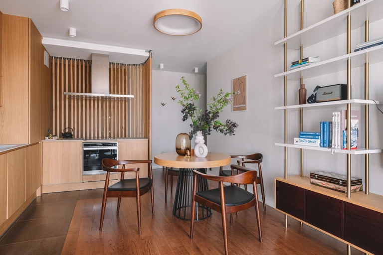 W mieszkaniu znajduje się salon z kuchnią, łazienka, dwie sypialnie oraz garderoba. Podstawowym celem realizacji było stworzenie ciepłego i przyjaznego wnętrza nasyconego naturalnymi barwami i materiałami. Projekt układu mieszkania zaproponowany przez dewelopera zakładał m.in. długi i ciemny korytarz. Aby rozjaśnić przestrzeń, projektantka postanowiła rozdzielić pomieszczenia ażurowym przepierzeniem. Przylega do niego zabudowa kuchenna, która dzięki prostym meblom nie dominuje strefy dziennej.