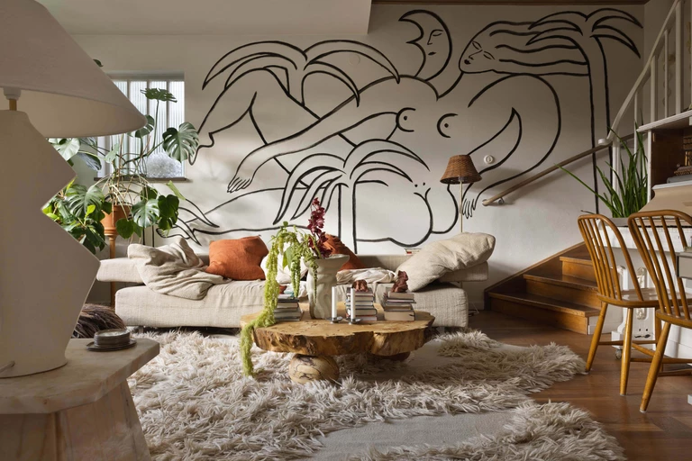 Postawiły na stonowaną, choć ciepłą paletę kolorystyczną, tak by sztuka grała pierwsze skrzypce. I choć w mieszkaniu roi się od fascynujących rzeźb, starych mebli, obrazów i ceramicznych naczyń, to największą uwagę przyciąga mural w salonie. To dzieło na zamówienie autorstwa artystki Alexandry Karpilovski. Choć czarno-białe, jego forma i skala sprawiają, że przedstawiona postać wydaje się niemal żywa.